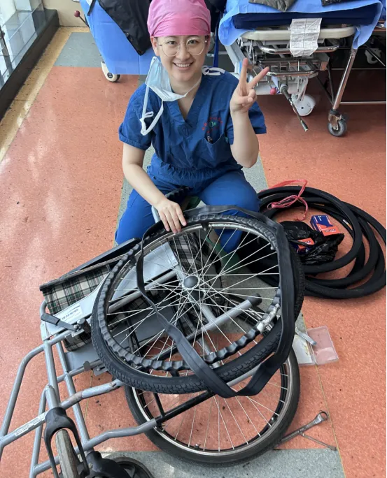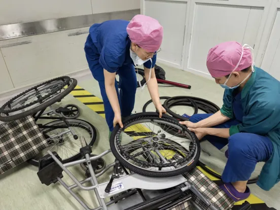 无影灯从清晨亮到夜幕,医护脚步几乎不停。在这片忙碌中,谭主任在日常巡查时发现:人还没累倒,轮椅先“累趴”了。几辆高频使用的转运轮椅轮胎严重磨损,推行时既费力又不稳。