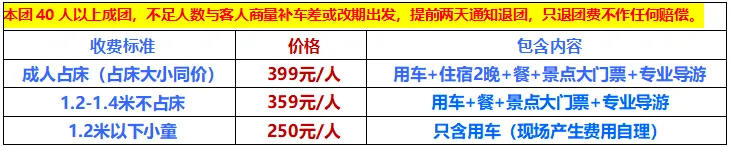 往返用车、行程景区门票、行程用餐、行程酒店住宿、导游服务费、旅行社责任险。
