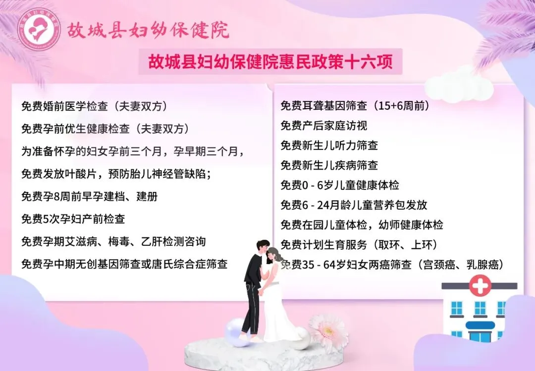 免费上环、取环、免费避孕药具领取、免费发放叶酸、免费婚前医学检查、免费孕前优生检查、早孕建册(按规定享受免费项目)。