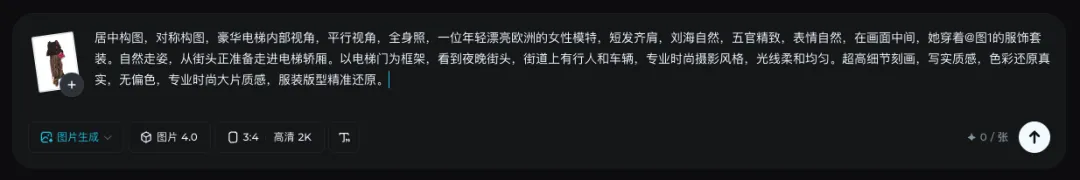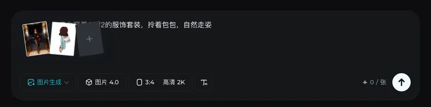 然后,我们打开即梦,将你的服装穿搭图片作为参考图,模型选择图片4.0,比例3:4,默认分辨率2K,这里建议使用超清4K出图效果更佳,然后再输入几句简单的提示词。