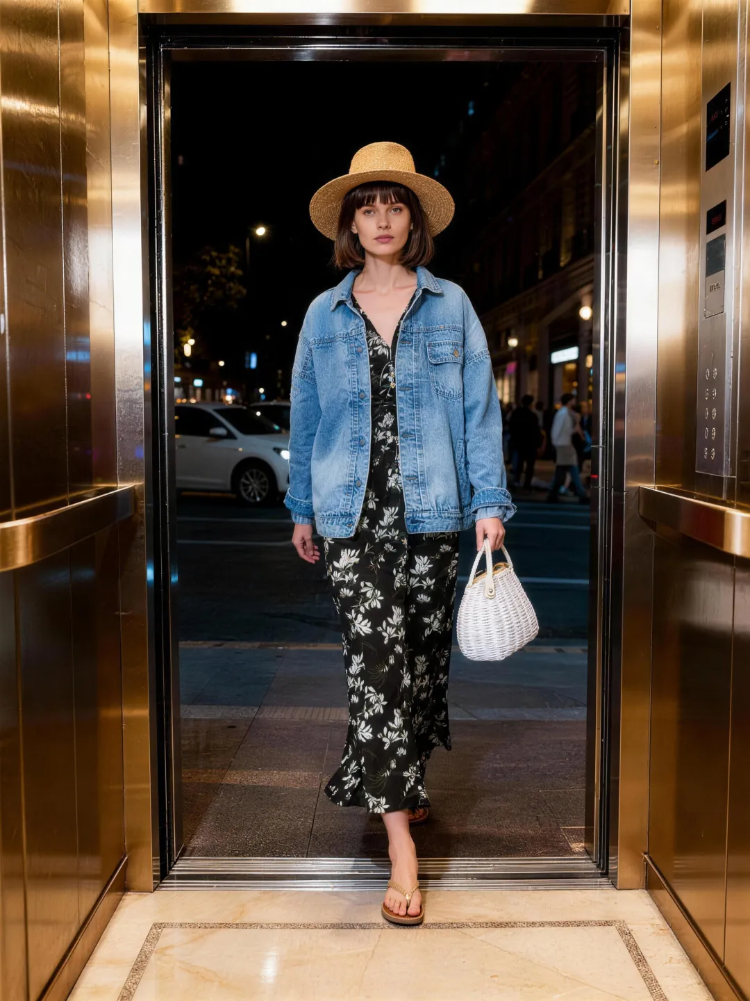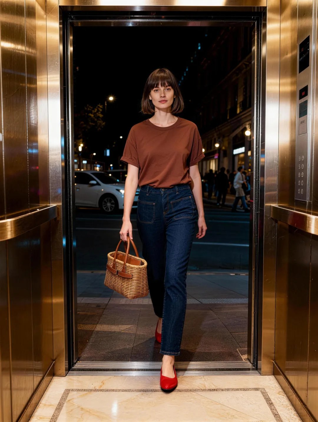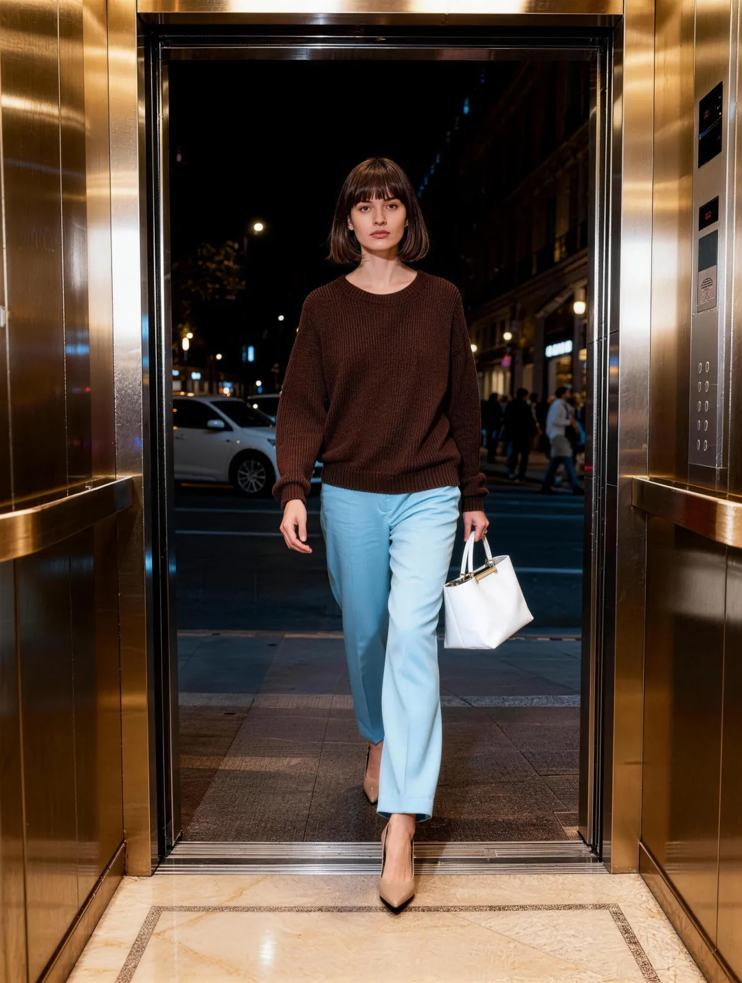 词:居中构图,对称构图,豪华电梯内部视角,平行视角,全身照,一位年轻漂亮的女性模特,短发齐肩,刘海自然,五官精致,表情自然,在画面中间,她穿着@图1的服饰套装。双手插兜,从街头正准备走进电梯轿厢。以电梯门为框架,看到夜晚街头,街道上有行人和车辆,专业时尚摄影风格,光线柔和均匀。超高细节刻画,写实质感,色彩还原真实,无偏色,专业时尚大片质感,服装版型精准还原。