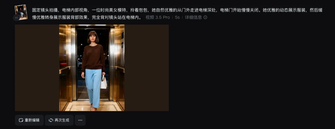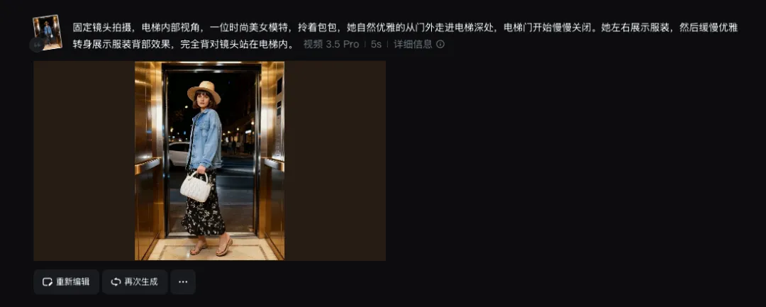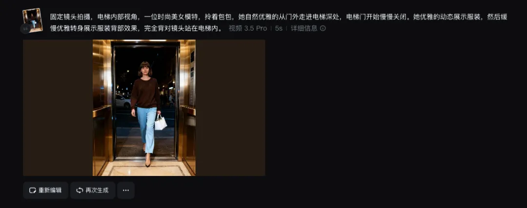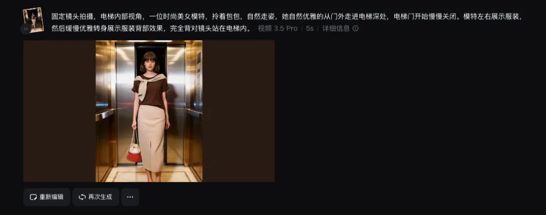 提示词:固定镜头拍摄,电梯内部视角,一位时尚美女模特,她自然优雅的从门外走进电梯深处,电梯门开始慢慢关闭。她优雅的动态展示服装,然后缓慢优雅转身展示服装背部效果,完全背对镜头站在电梯内。