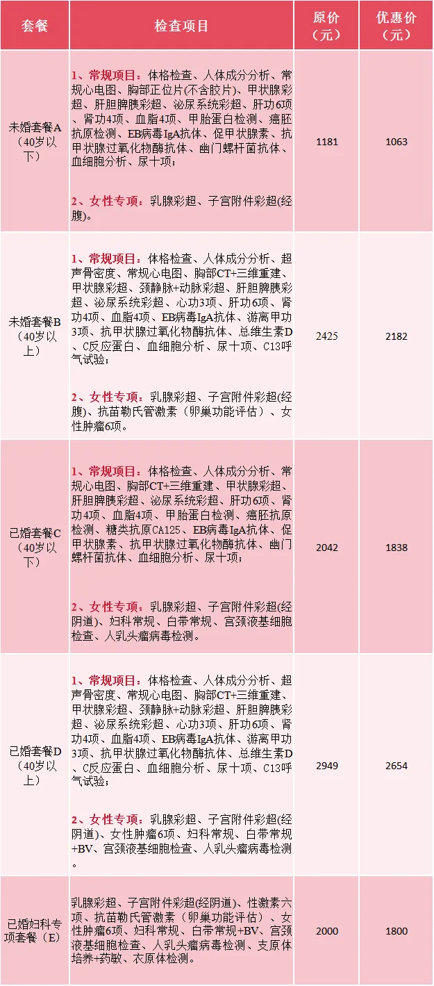 套餐精准覆盖未婚/已婚、40岁以下/以上女性健康需求,常规基础检查+女性专项筛查双重保障,优惠直降,健康不打折!