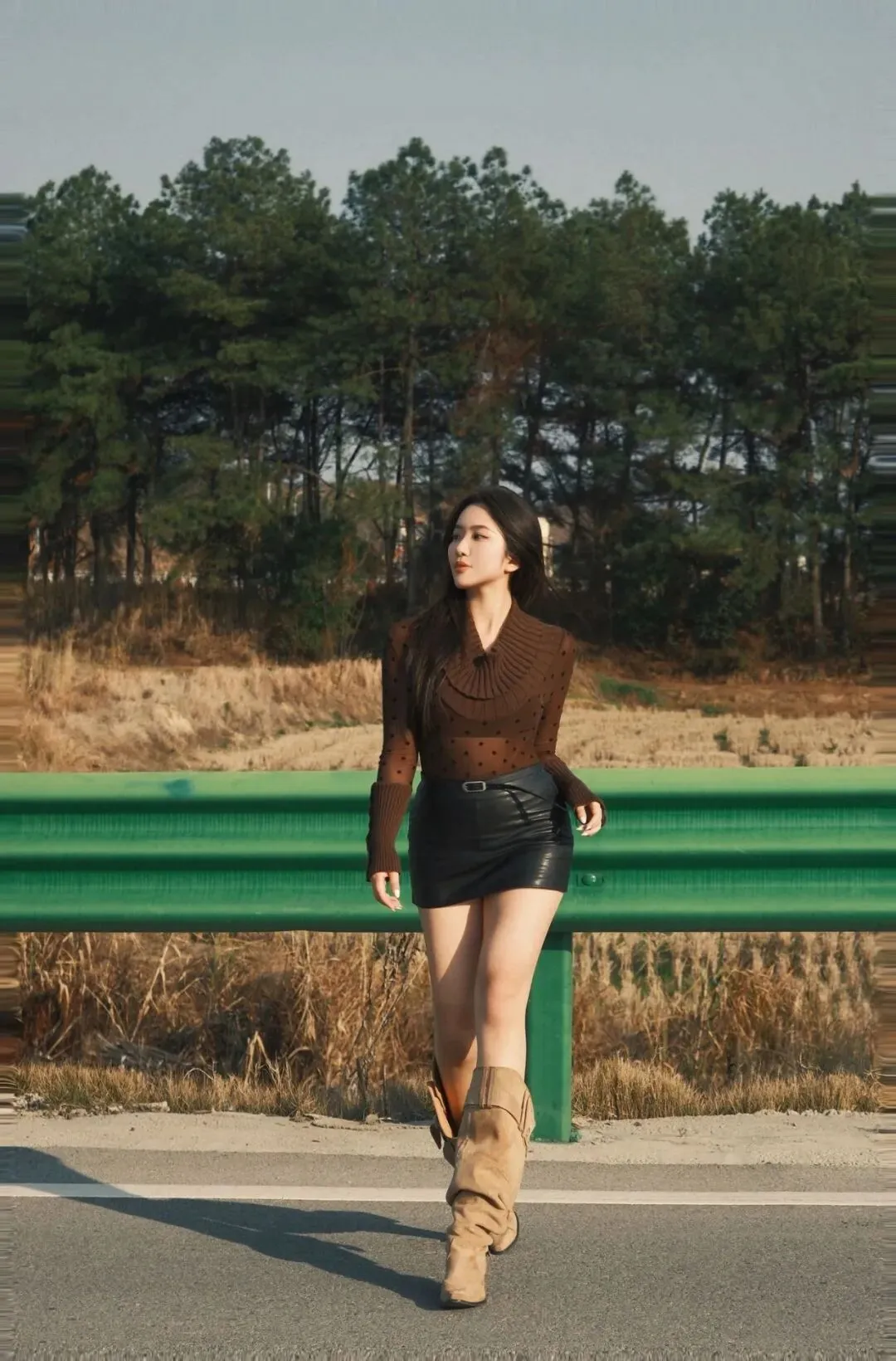 侧身蹲在路边,膝盖不用完全蹲到底,保持舒服的姿势,身体放松,然后回头微笑着看向远方。路边拍照这个动作很有氛围感,跟着模特这样做,松弛又自然,拍出来特别漂亮,出片率很高。