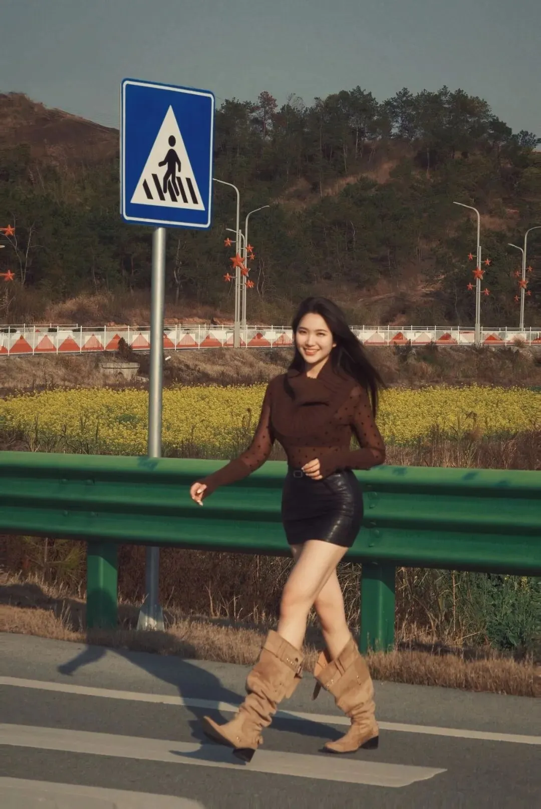 侧身蹲在路边,身体放松,腰背不用挺直,自然弯曲就好,抬头看向镜头,脸上带着温柔的微笑。路边拍照这个姿势很温柔,跟着模特学,松弛又自然,拍出来很漂亮,新手也能轻松驾驭。