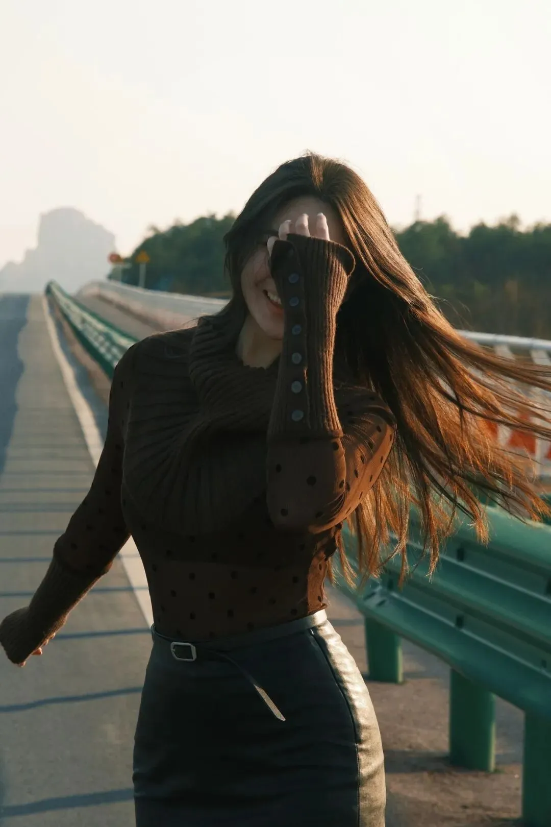 沿着路边慢慢走路,脚步随意,一边走一边轻轻撩一下耳边的头发,脸上露出大方的大笑,不用拘谨。路边拍照这样摆,完全是模特的松弛感,自然又漂亮,拍出来很有感染力,超出片。