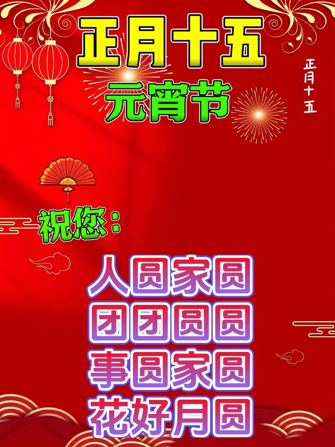 3. 今天是正月十五,元宵节,希望大家开开心心闹元宵😄,快快乐乐挣大钱💰,元宵佳节,祝愿大家,团团圆圆👨‍👩‍👧‍👦,和和美美!元宵节快乐🥳!