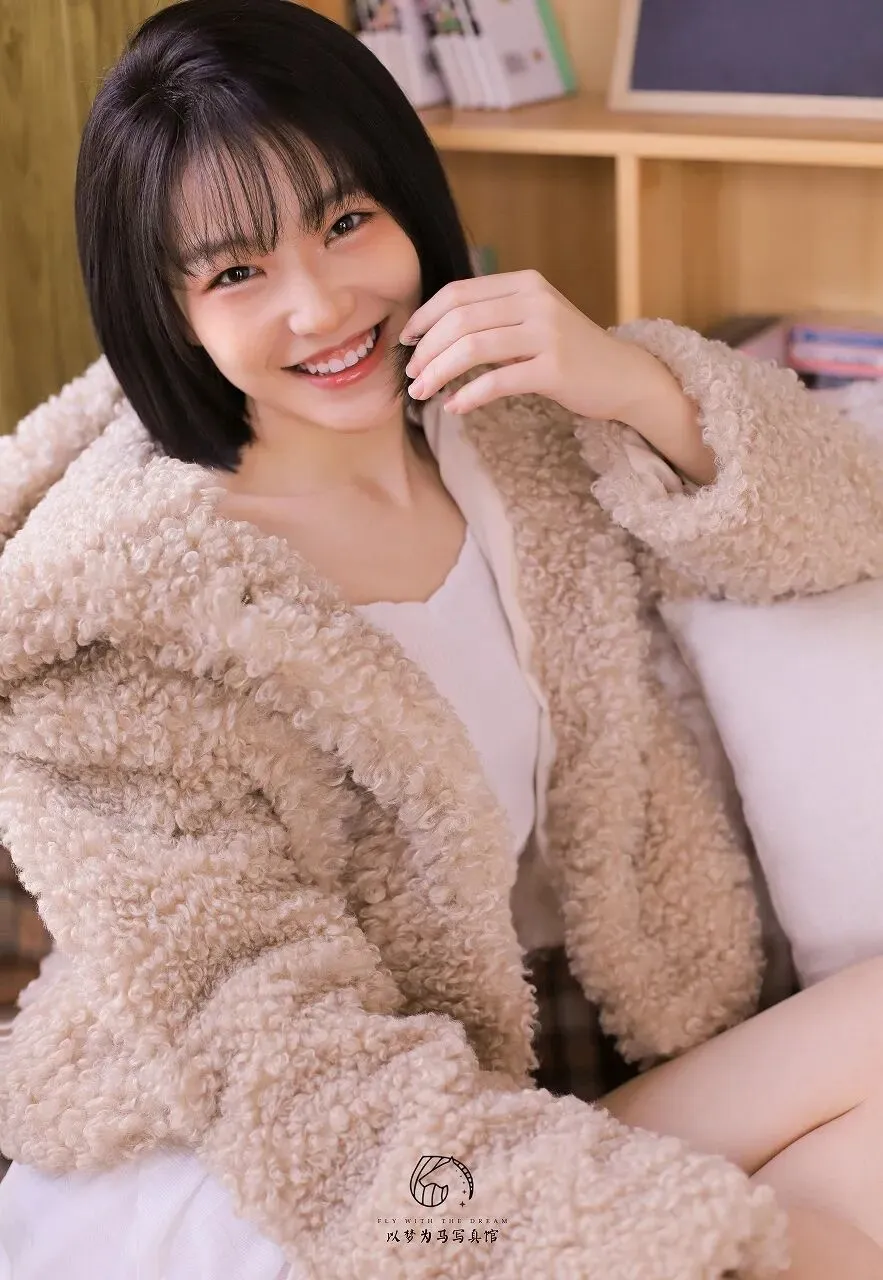 在喧嚣纷扰的尘世中,我们总在寻觅一处能让心灵栖息的角落,一个可以放下疲惫与防备,尽情享受宁静与温暖的地方。而对于她来说,这个角落或许就是此刻所在的这间暖居。她坐在柔软的沙发上,周身萦绕着一种慵懒而惬意的氛围,仿佛时间都在这一刻放慢了脚步。她身着一件简约的白色吊带背心,纯净的白色如同冬日里的初雪,衬托出她肌肤的细腻与柔滑。吊带的设计露出她精致的锁骨和优美的肩部线条,透着一丝不经意的性感。她的双腿白皙修长,腿上穿着白色的蕾丝袜子,增添了几分少女的甜美与俏皮。此时,她正将一件米白色的毛绒外套随意地搭在身上,毛绒的质感柔软蓬松,像是云朵般轻柔,给人以温暖的感觉。她的短发整齐利落,发梢微微内扣,衬托出她小巧的脸庞。齐刘海下,一双眼睛微微眯起,嘴角上扬,露出一抹灿烂的笑容,那笑容如同春日里的阳光,温暖而明亮,能驱散人心中的阴霾。她的姿态放松而自然,一只手轻轻搭在腿上,另一只手或许正感受着毛绒外套的柔软,整个人都沉浸在这份闲适之中。