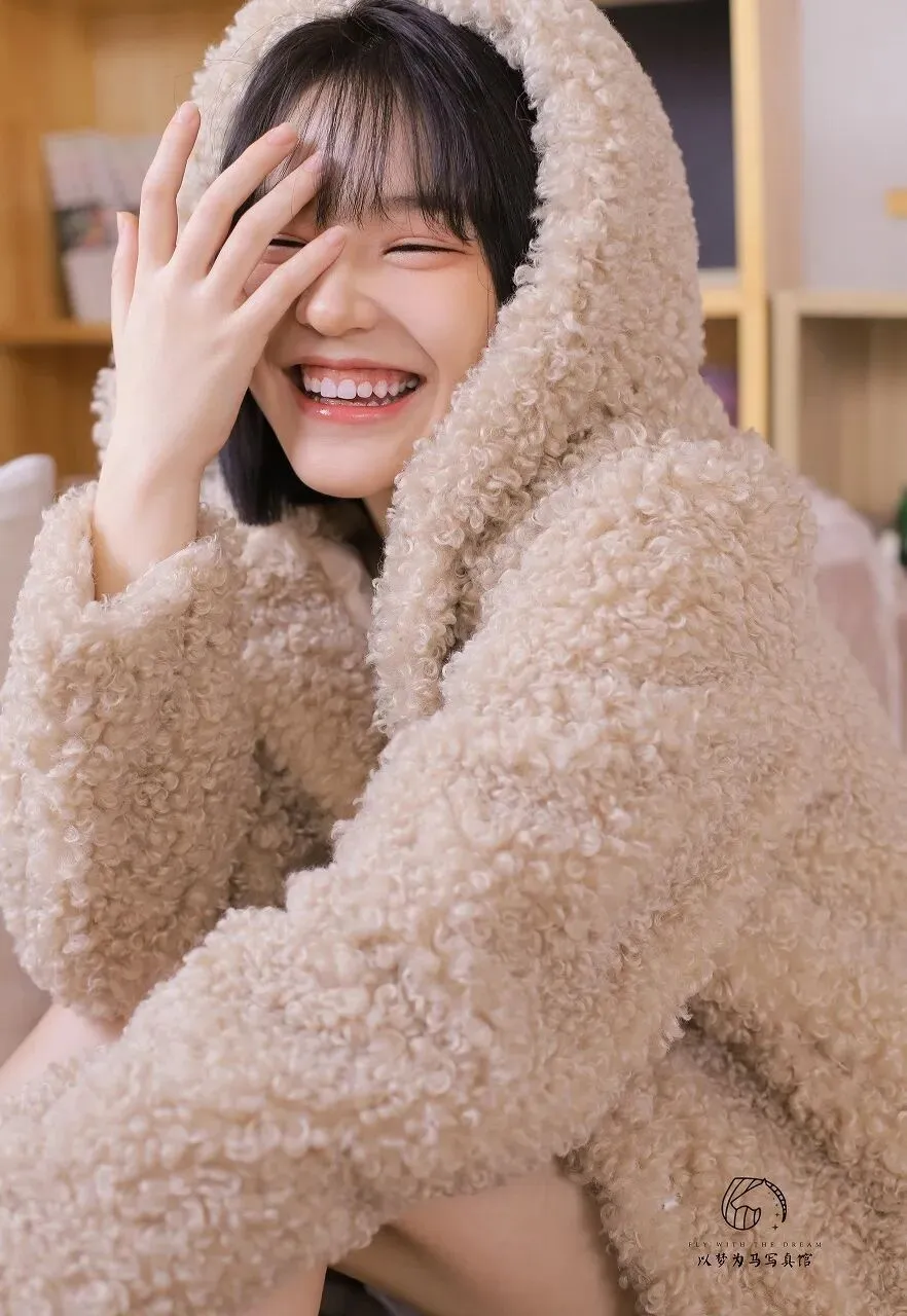 房间的背景是木质的墙壁,木纹清晰可见,散发着自然的气息。墙壁旁有一个木质的书架,上面摆放着几本书籍,虽然书籍的封面并不清晰,但可以想象,在闲暇的时光里,她会随手拿起一本,沉浸在文字的世界中,享受着阅读带来的快乐。窗户透进明亮的光线,照亮了整个房间,让一切都显得那么温馨而舒适。这样的场景,让人不禁联想到生活中的小确幸。那些看似微不足道的瞬间,却能给我们带来深深的满足和幸福。就像在忙碌了一天后,回到家中,窝在柔软的沙发上,享受着属于自己的宁静时光。或许会泡上一杯热茶,让袅袅的热气温暖身心;或许会听一首喜欢的音乐,让悠扬的旋律舒缓神经。而她,在这暖居之中,用自己的方式诠释着这份闲适与惬意。毛绒外套是冬日里的温暖守护者。它那柔软的质地,仿佛能抵御外界的一切寒冷。当寒风凛冽时,披上这样一件外套,就像被一个温暖的怀抱所包围。它不仅仅是一件衣物,更是一种情感的寄托,代表着对温暖的追求和对生活的热爱。就像她,将毛绒外套随意地披在身上,展现出一种随性与自在,仿佛在告诉世界,她正享受着这份温暖与舒适。