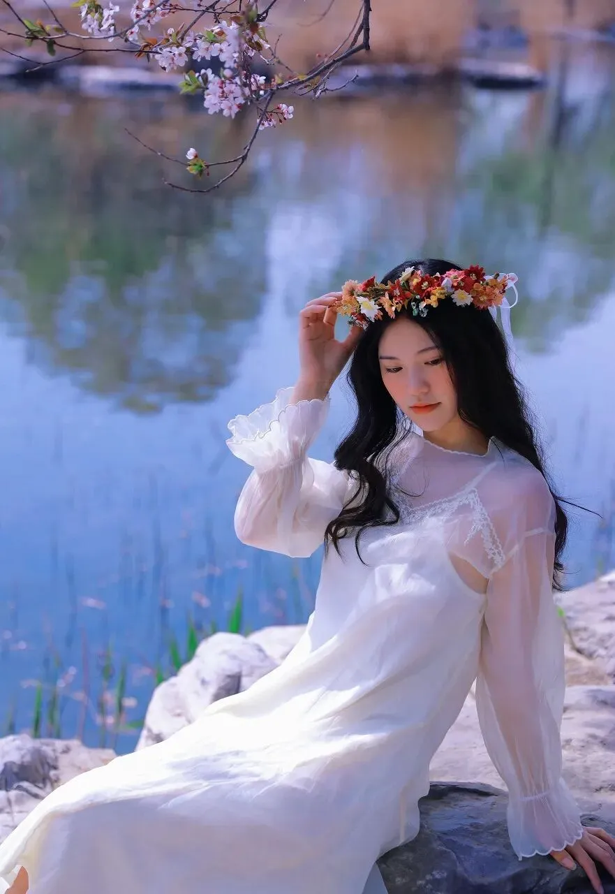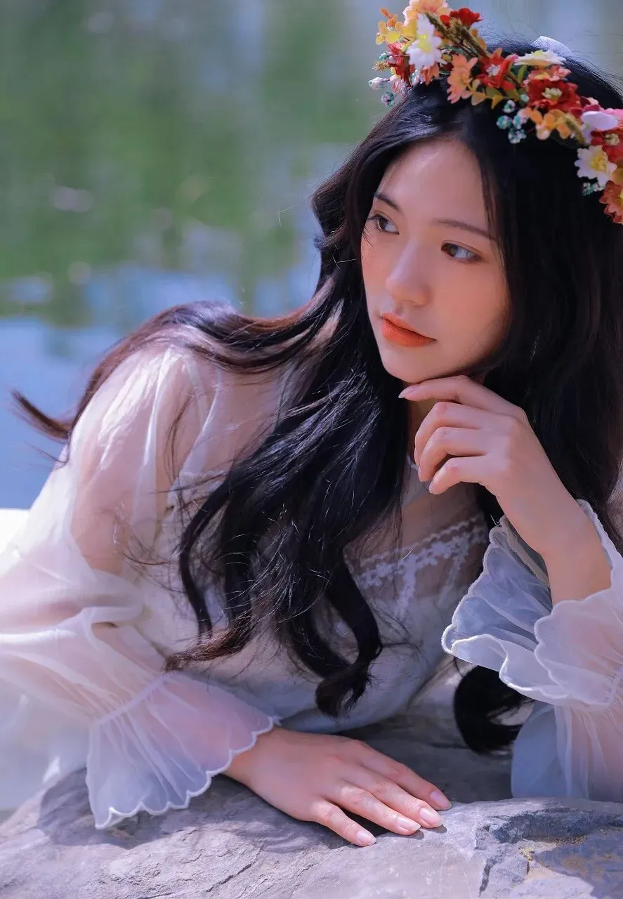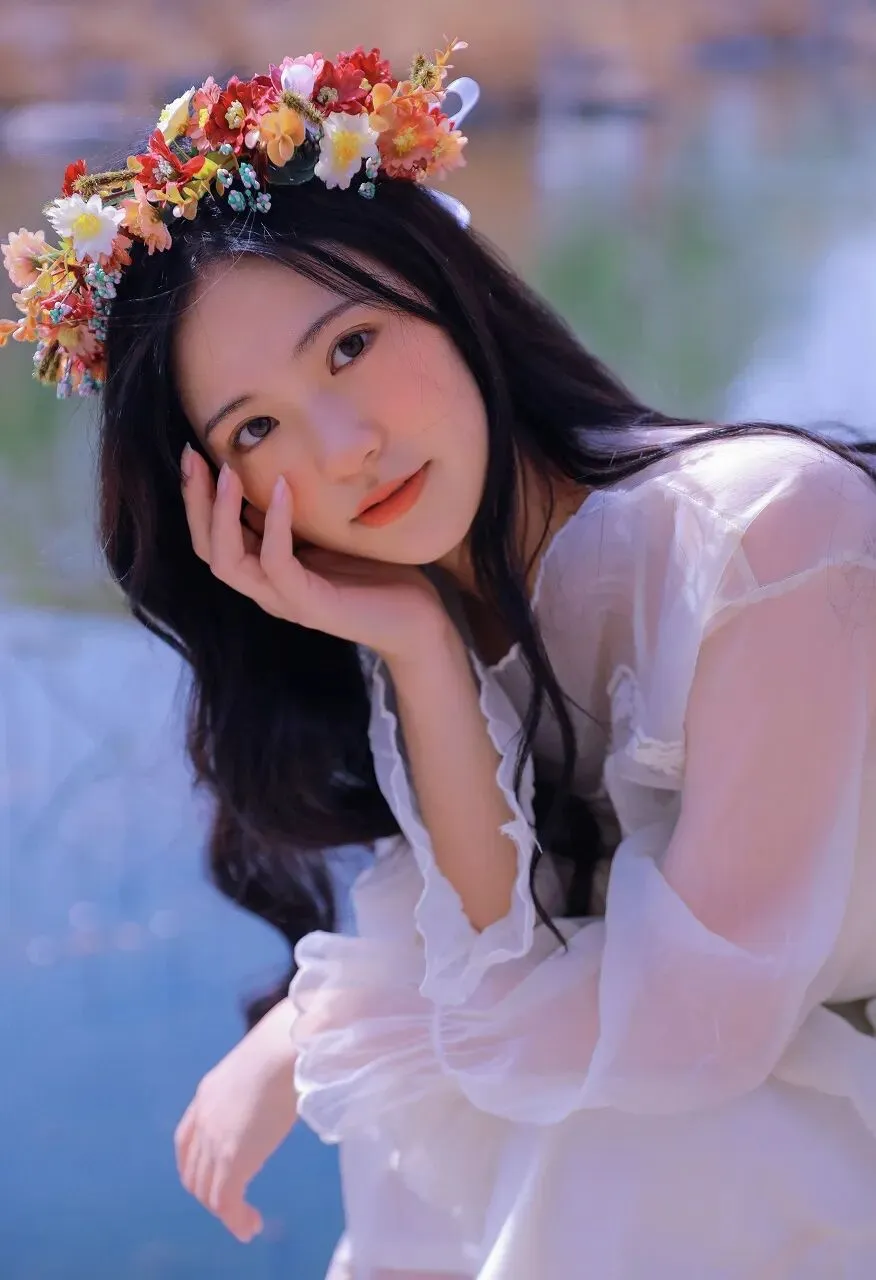 在时光的温柔角落,阳光轻洒,微风轻拂,一位头戴花环的女子宛如从梦幻中走来的精灵,静坐在一片静谧的水边。她的存在,仿佛是大自然与人类美好融合的化身,带着独有的温婉与灵动,诉说着一段与自然邂逅的浪漫故事。女子身着一袭轻盈的白色薄纱长裙,薄纱的材质如云雾般飘逸,在阳光的映照下,泛着柔和的光泽。长裙的剪裁简约而优雅,袖口处微微的褶皱设计,增添了几分浪漫的气息。她的长发如黑色的绸缎般自然垂落,发间戴着一个由五颜六色花朵组成的花环。花朵种类繁多,有鲜艳的红色、明亮的橙色、清新的白色,它们相互交织,如同打翻的调色盘,为女子增添了无尽的生机与活力。她的手轻轻托着脸颊,眼神温柔而宁静,仿佛在凝视着远方,又似在沉思着什么。那眼神中,透着对大自然的热爱与敬畏,也藏着少女内心深处的温柔与细腻。她的妆容淡雅精致,橘色的唇色与周围的花朵相呼应,更显甜美动人。