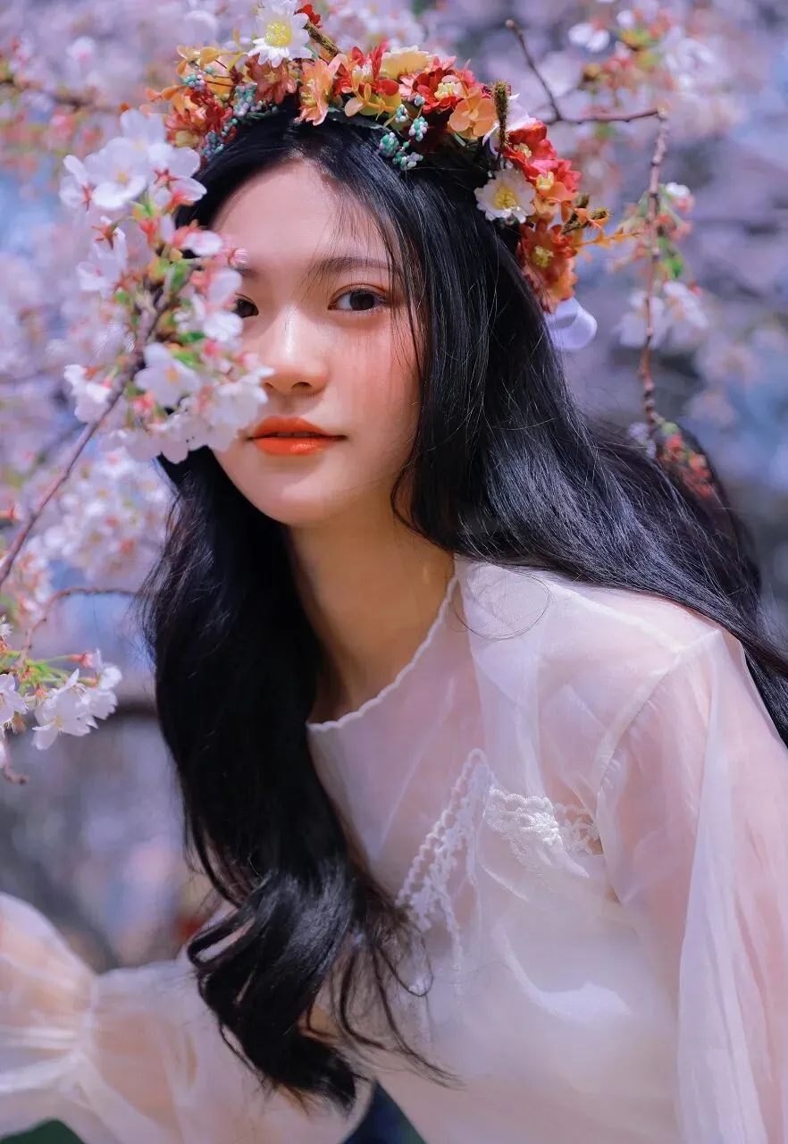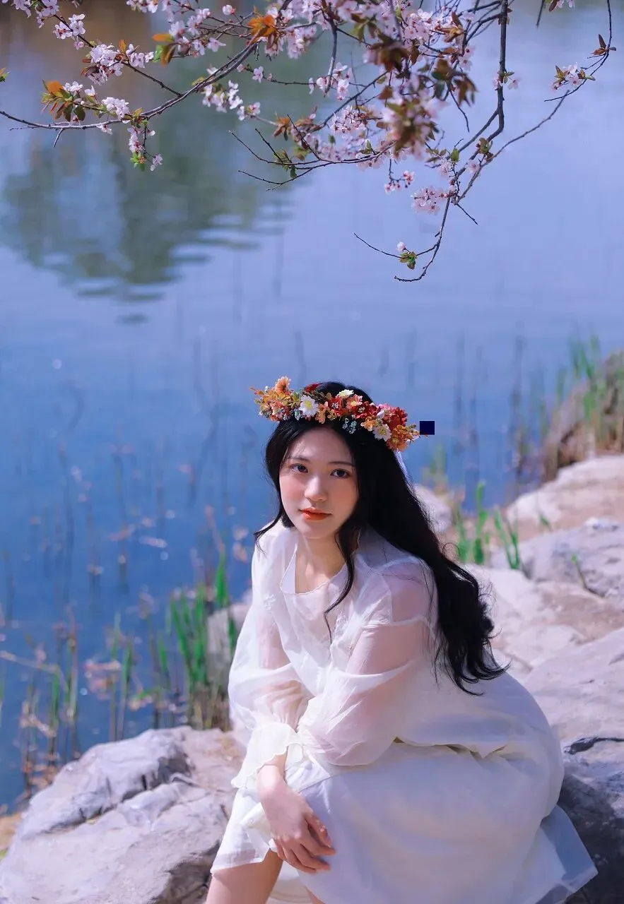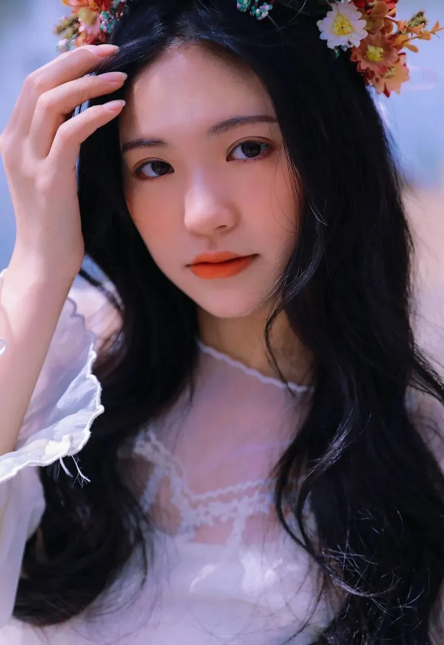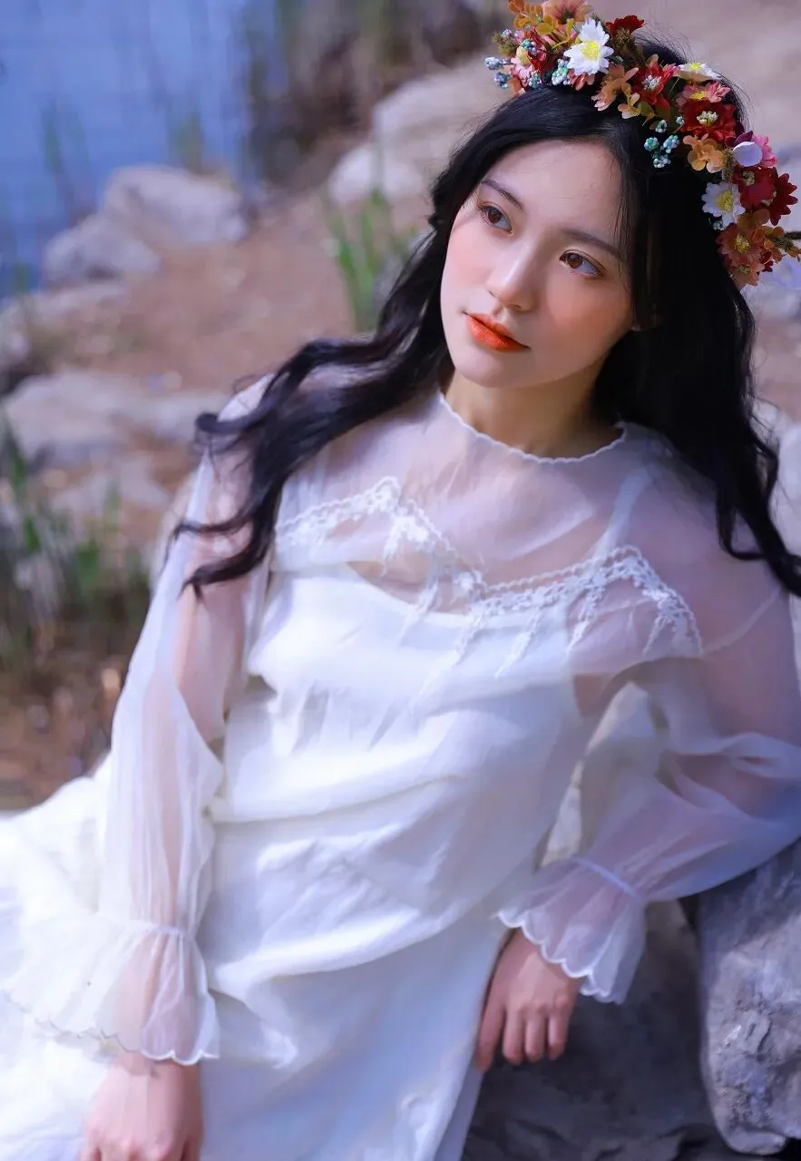 在时光的温柔角落,阳光轻洒,微风轻拂,一位头戴花环的女子宛如从梦幻中走来的精灵,静坐在一片静谧的水边。她的存在,仿佛是大自然与人类美好融合的化身,带着独有的温婉与灵动,诉说着一段与自然邂逅的浪漫故事。女子身着一袭轻盈的白色薄纱长裙,薄纱的材质如云雾般飘逸,在阳光的映照下,泛着柔和的光泽。长裙的剪裁简约而优雅,袖口处微微的褶皱设计,增添了几分浪漫的气息。她的长发如黑色的绸缎般自然垂落,发间戴着一个由五颜六色花朵组成的花环。花朵种类繁多,有鲜艳的红色、明亮的橙色、清新的白色,它们相互交织,如同打翻的调色盘,为女子增添了无尽的生机与活力。她的手轻轻托着脸颊,眼神温柔而宁静,仿佛在凝视着远方,又似在沉思着什么。那眼神中,透着对大自然的热爱与敬畏,也藏着少女内心深处的温柔与细腻。她的妆容淡雅精致,橘色的唇色与周围的花朵相呼应,更显甜美动人。