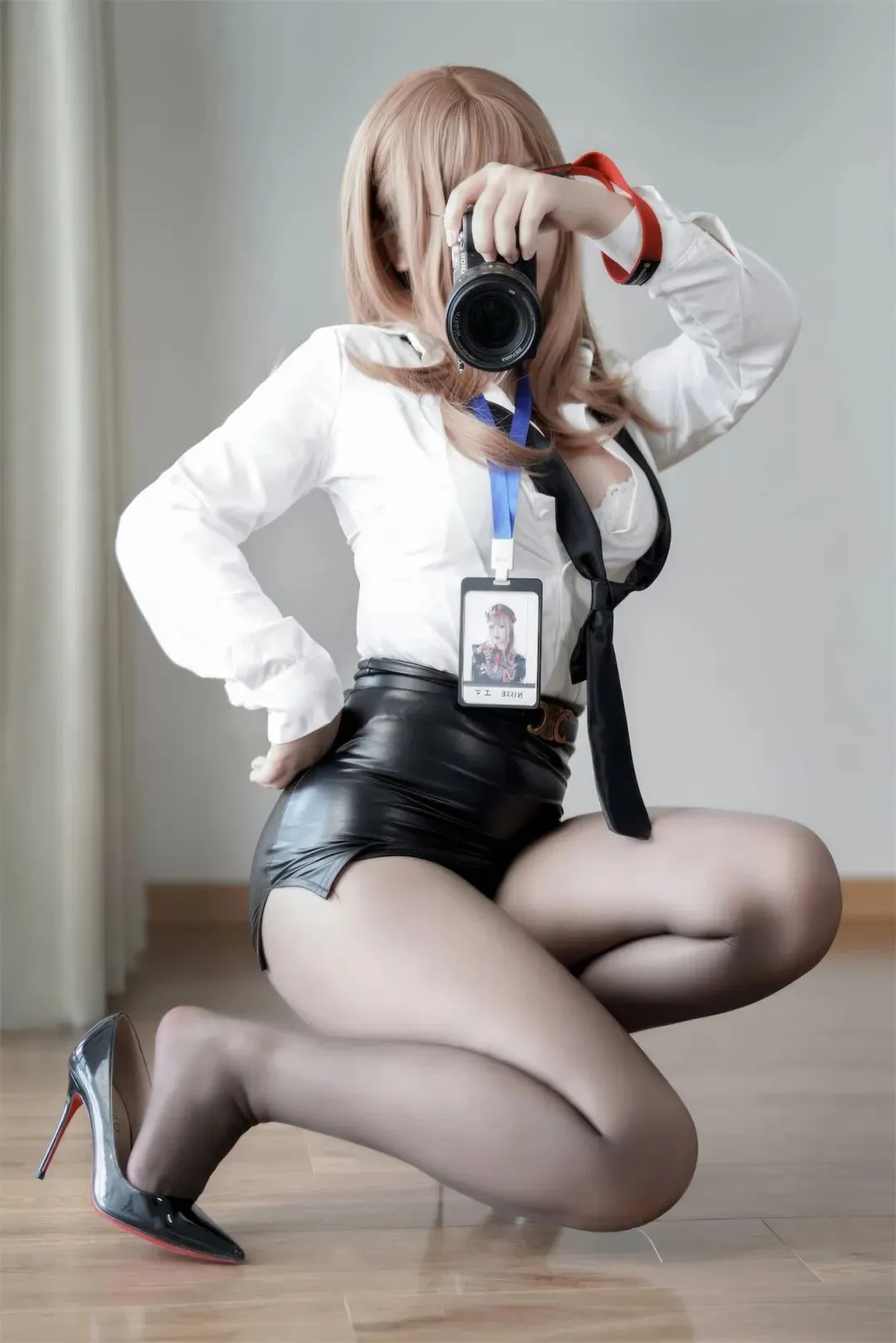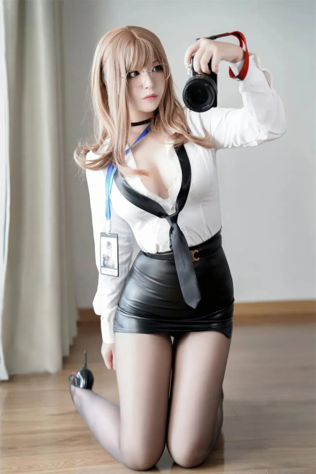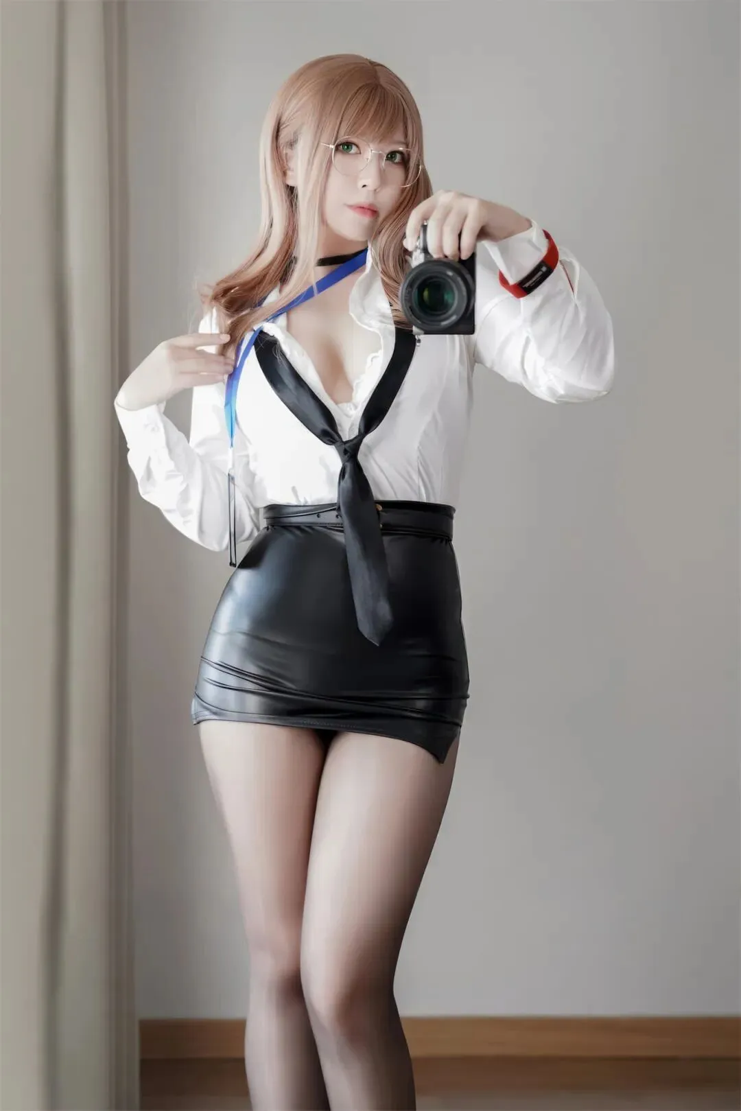白色的衬衫被随意地解开几颗纽扣,黑色的领带松垮地挂在颈间,搭配上亮面的黑色皮裙和黑丝,艾玛的造型完美诠释了“危险的办公室”这一主题。她手中的相机,既是她记录世界的工具,也是她与观众互动的桥梁。