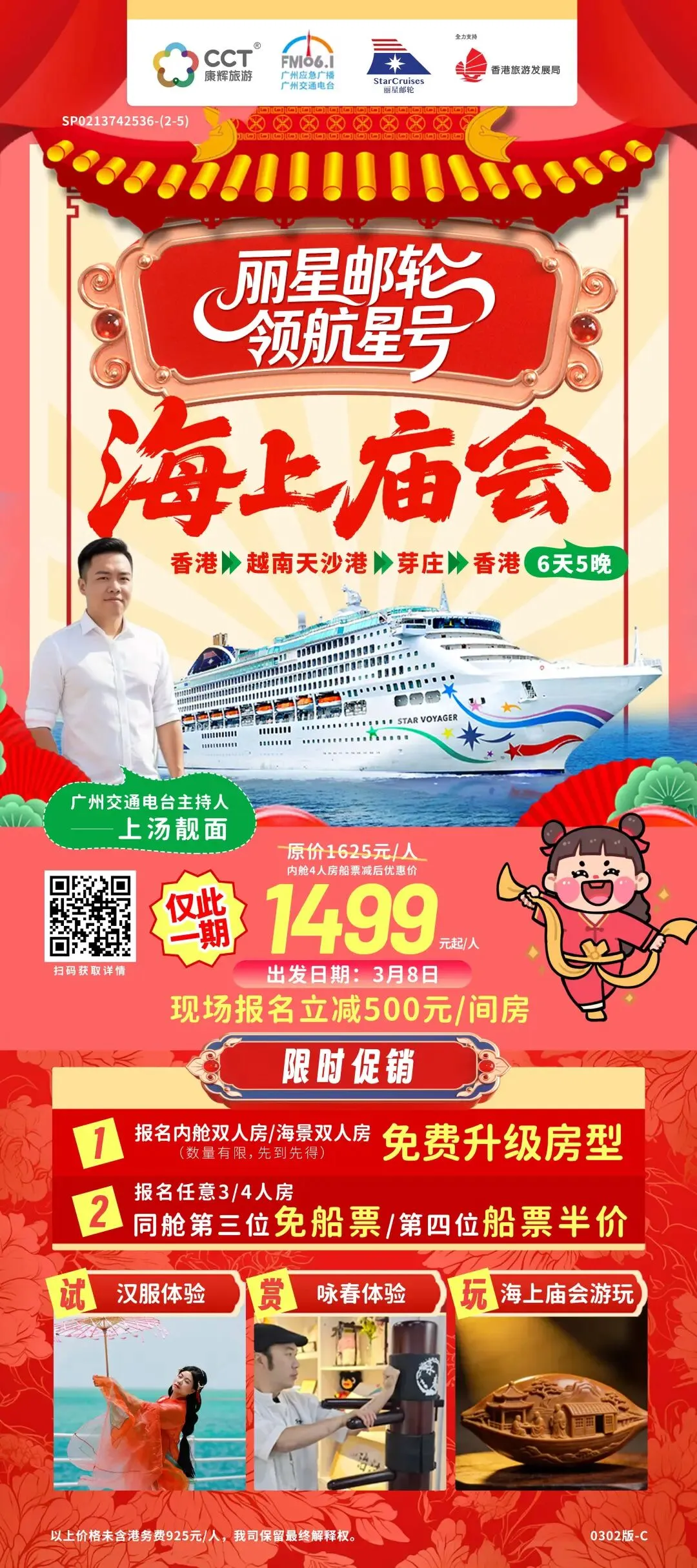 ✅ 报名任意3/4人房:同舱第三位0元船票,同舱第四位船票半价