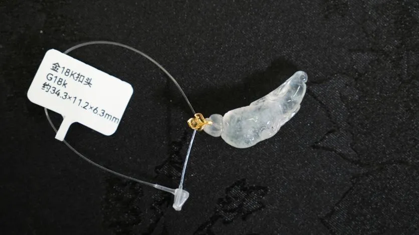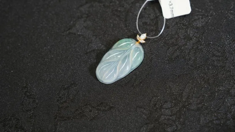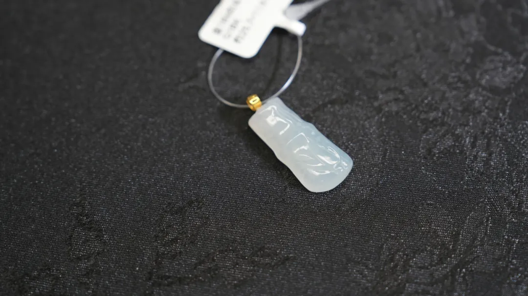 这款翡翠人生如意挂件,真的高高冰,像是冬天里凝住的冰块一样,又冰又润,非常美,还做了18k金的镶嵌。