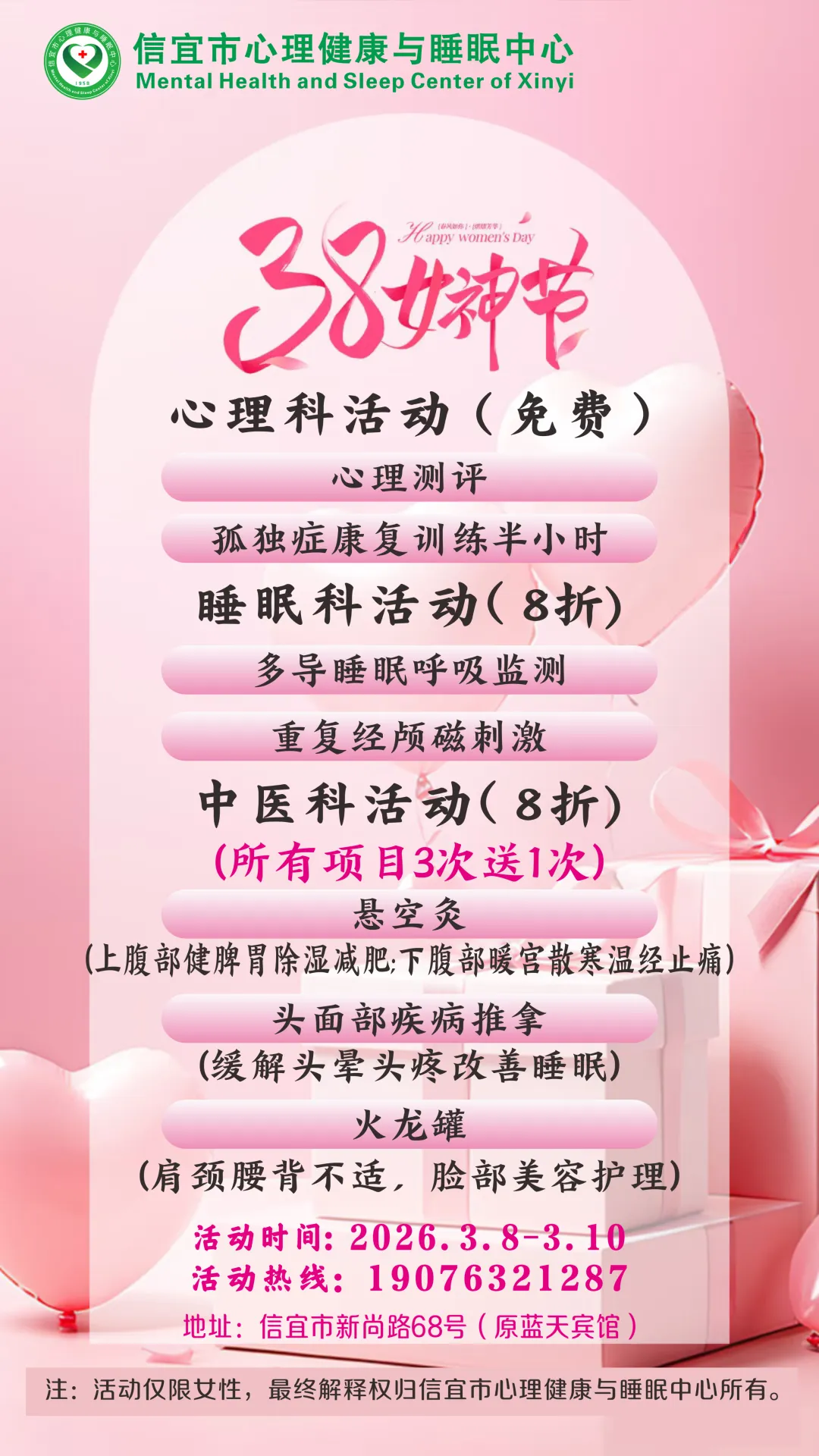 当前位置:首页>美女资讯>女神节限定福利!信宜市心理健康与睡眠中心,三大科室优惠来袭!