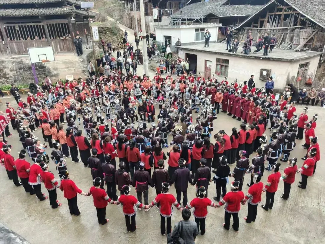 龙溪寨就地取材,乡亲们严密组织精诚合作,几经周折建成了高大漂亮榫卯结构的木质寨门。举寨欢庆,外嫁的姑娘姑妈们闻知娘家喜添寨门,还特地一起身着盛装,挑着礼物,敲锣打鼓回龙溪道贺,于是又有一场规模更大的姑妈回家表演活动。吹芦笙、唱山歌、拦寨门、敬酒歌、“多也”此起彼伏,锣鼓喧天鞭炮齐鸣,真是异彩纷呈热闹非凡。