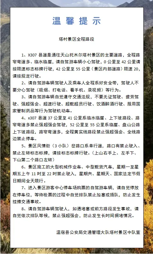 温宿县公安局交通管理大队温馨提示您:X307县道,是通往天山托木尔峰塔村景区的主要道路。因该条道路全程路面较窄,特别是7公里至42公里路段沿途弯道和临水临崖路段较多。全程约35公里的路途,请司机师傅们谨慎驾驶,驾驶途中请驾驶员系好安全带,车辆不要超员、超速、无证驾驶、强超强会,更不要酒后驾驶机动车,建议全程单程不要少于40分钟,在景区驾驶共享单车请遵守一人一车一盔,祝您旅途愉快、一路顺风。