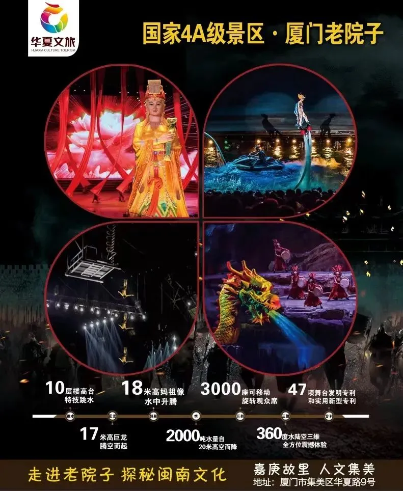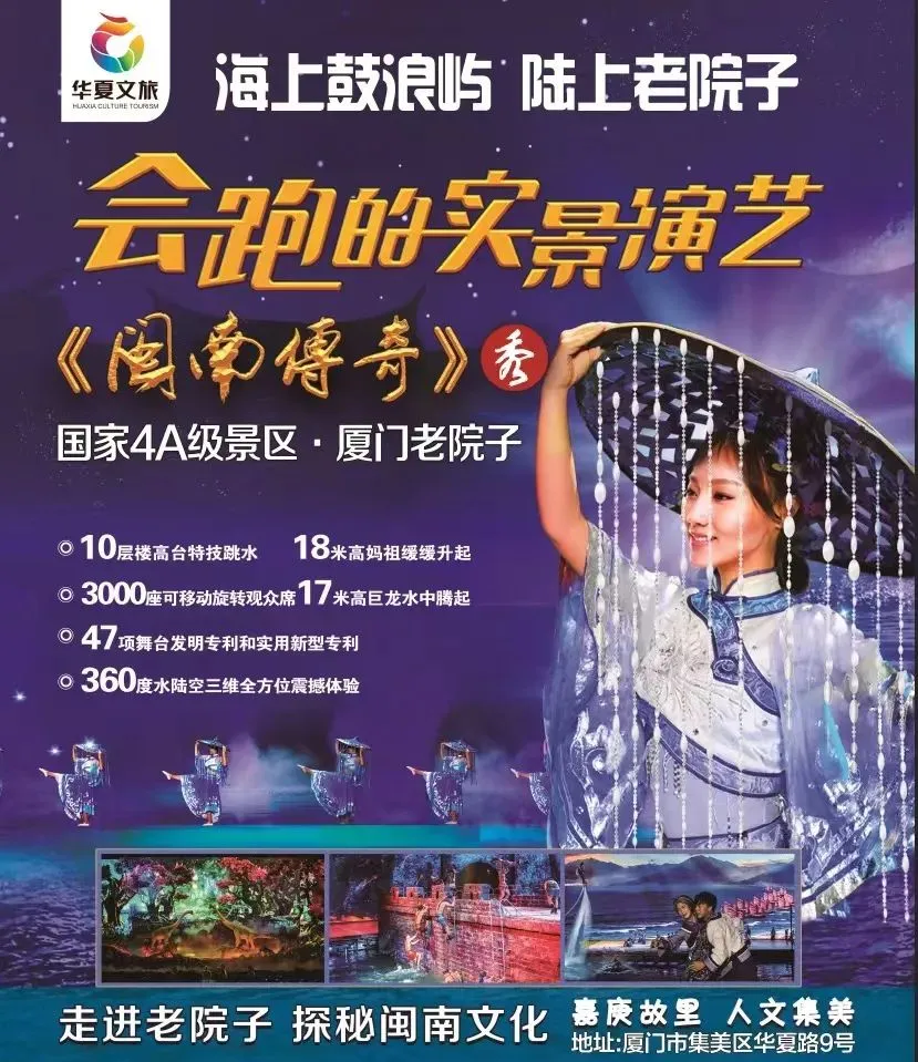 观赏【世界首家360°顶级环绕室内实景舞台秀——闽南传奇】闽南传奇秀打破了五千年来单一的舞台观演模式,通过移动看台把观众送到每幕视角的最佳观赏位置,欣赏真山真水演出。会跑的观众席被包装为一艘巨轮,四周以水面做掩体,各种大件舞美埋在水中内藏玄机【恐龙王国】、【极限跳水】、【火山爆发】、【岛城大战】、【海上斗匪】、【水面飞兽】、【飞龙出水】幕幕精彩不断,给大家带来悬念,震撼,刺激、欢快的超级文化娱乐体验。