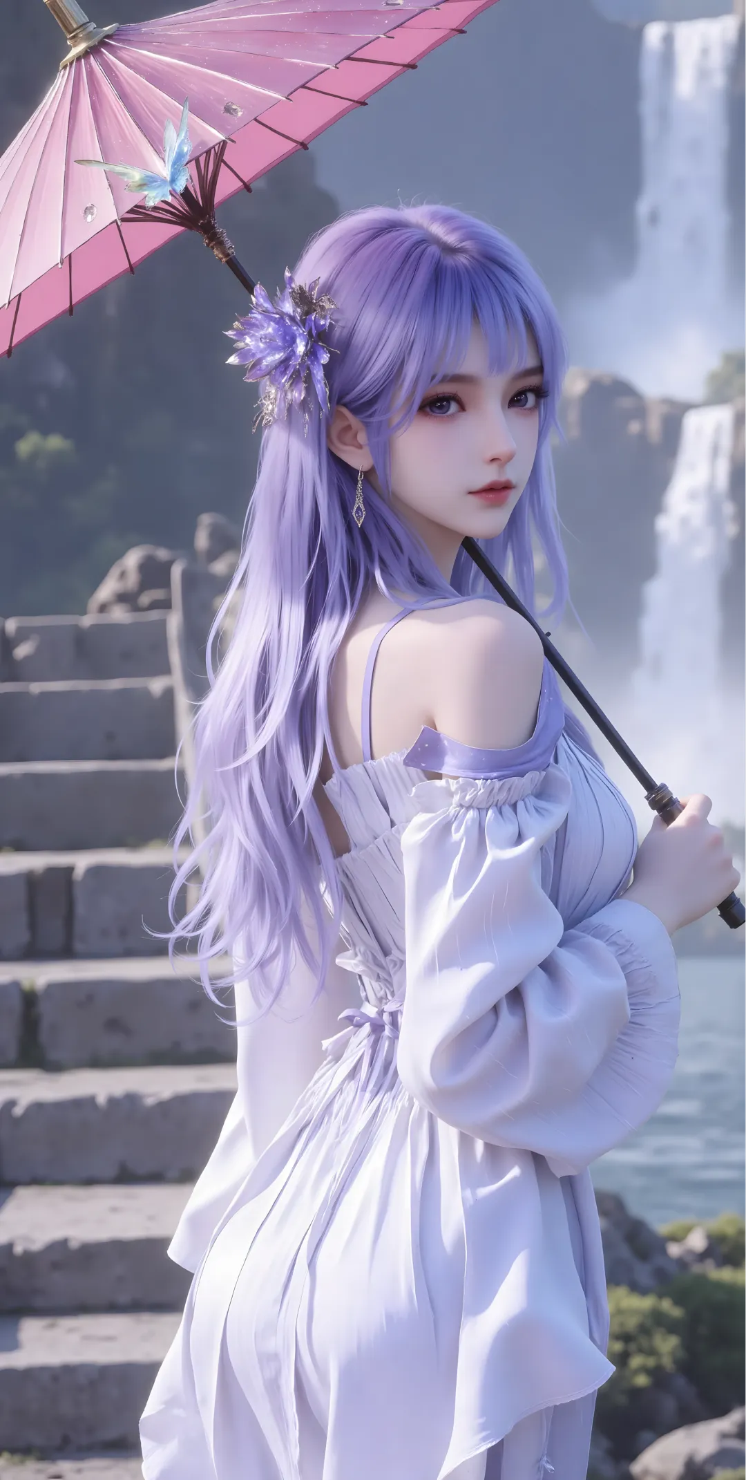 一头紫发长至脚踝,浓密顺滑,泛着浓郁而莹润的紫光,不再随意散落,而是自然垂落,发丝间萦绕着淡淡的圣洁光晕,随风轻扬时,宛如紫色的星河流动,偶尔会有几缕发丝被灵力吹动,贴在脸颊,添了几分灵动与圣洁。此时的她,既有死神的凌厉威慑,又有圣女的高贵圣洁,破碎感与力量感并存,成为圣魔大陆上最耀眼的存在之一。