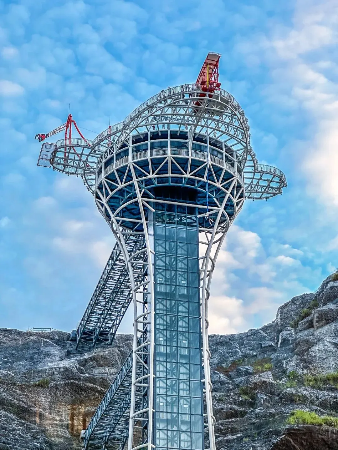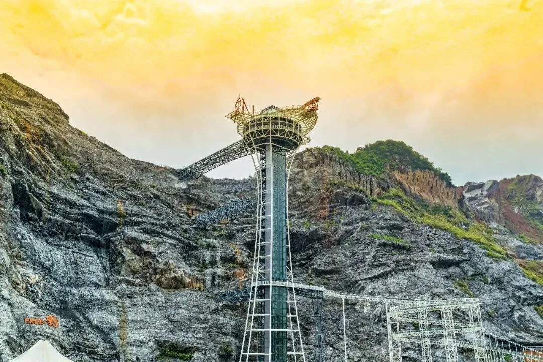 乘坐观光电梯,登上百米高塔,体验人在云中游的绝美景色,金石塔为景区的标志性建筑,塔高101米,整体造型纤细优美,酷似一位披着飘逸幔纱的仙女,形式“小蛮腰”,金石塔融合了悬崖蹦极、悬崖秋千、悬崖漂流、天空之境等5大休闲体验项目,为游客提供多元化的刺激体验。