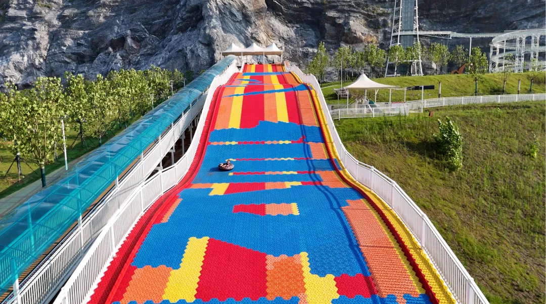 超刺激的彩虹滑道总长400米,当我们从几十米高的地方倾泻而下,就像一道彩虹挂在山坡上,可以感觉风驰电掣般的刺激。