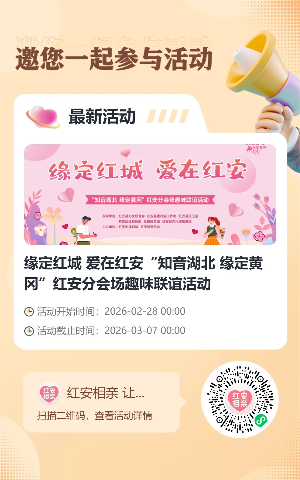 为积极响应湖北省2026年十大民生项目中“倡导积极婚育观,组织婚恋交友服务1000场”的工作号召,全面落实省妇联“知音湖北 才聚荆楚”千场青年交友联谊活动部署,红安县妇联将在春节期间陆续举办多场【知音湖北 缘定黄冈】红安分会场青年交友联谊活动,持续擦亮“缘定红城 爱在红安”活动品牌,切实服务青年男女婚恋交友需求,助力广大青年安心安家、建功立业。