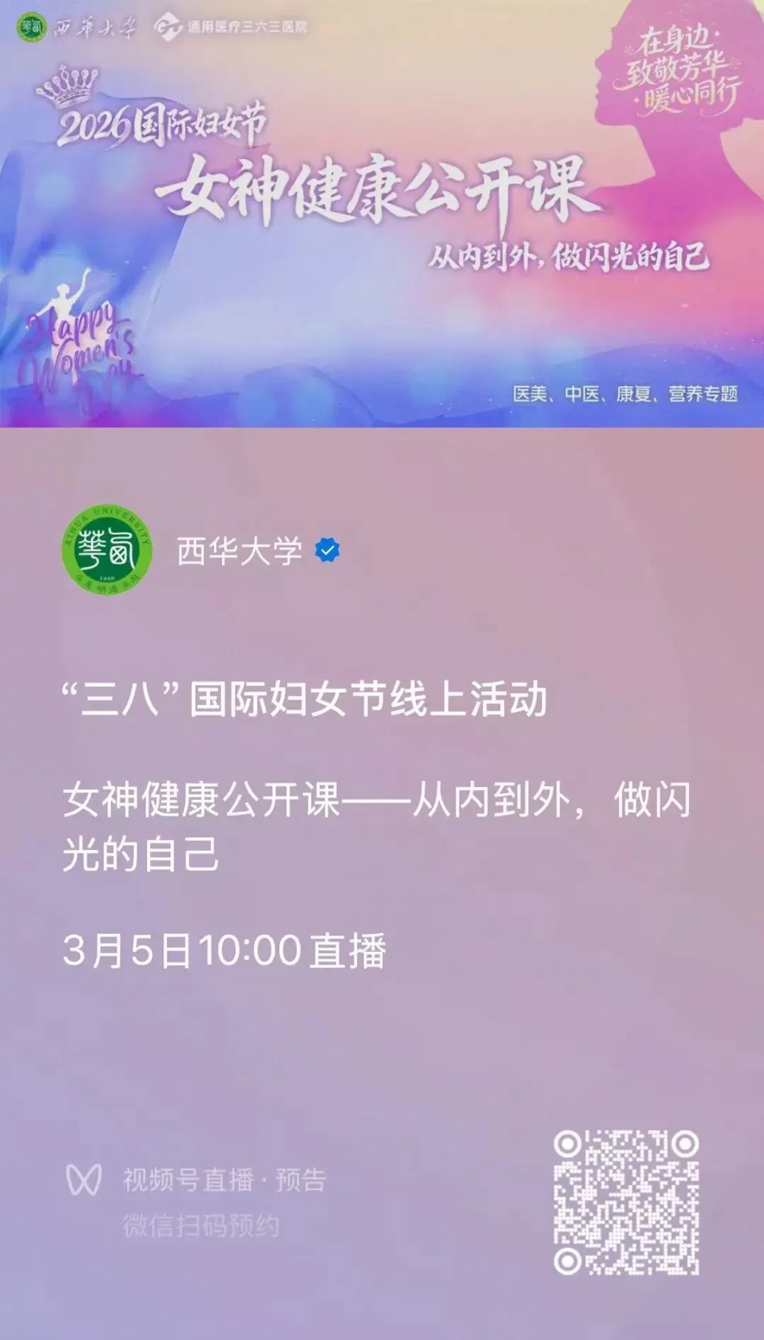 这个三八节,西华大学始终心系每一位女教工,愿你在忙碌的工作生活中,不忘关爱自身健康,绽放独属于自己的光芒与美好,三场活动,期待与你相遇!