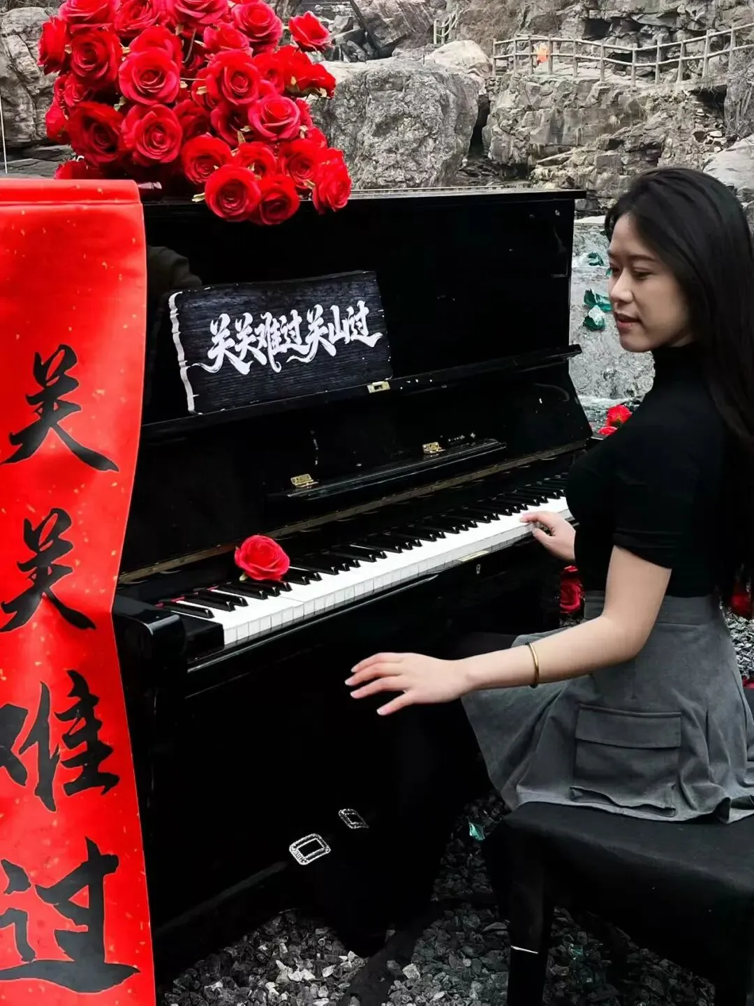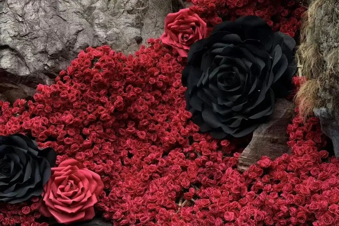 黑红玫瑰瀑布:崖壁上倾泻而下的红与黑,站在瀑布前,远景拍全身显大气,近景拍指尖碰花瓣,自带高级冷感滤镜。