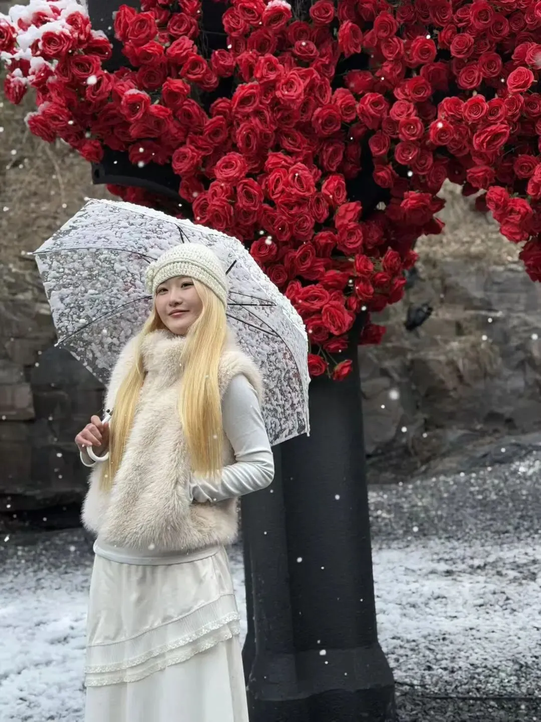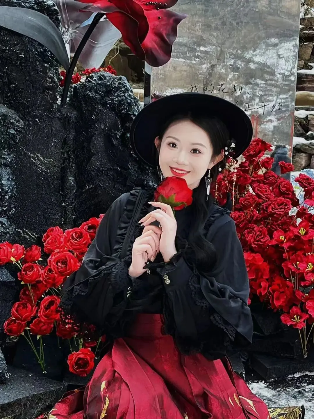 永夜之门:黑红玫瑰缠绕的复古拱门,雪中更显神秘温柔。漫步穿过或静静站立,仿佛闯入了小众童话世界。