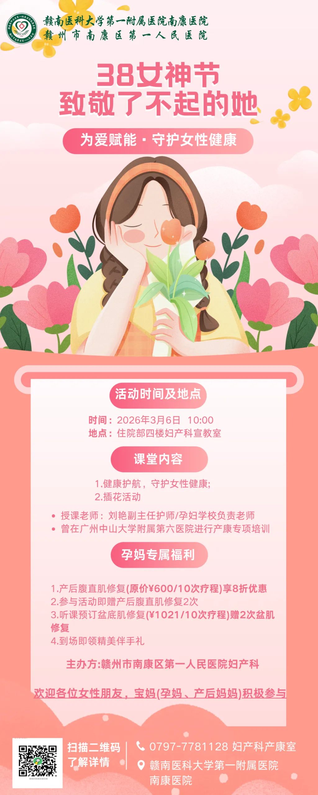 健康是女性最美的底色,南康区第一人民医院妇产科始终以守护女性健康为己任。本次女神节活动,既是对女性力量的致敬,也是我院践行 “以患者为中心” 服务理念的生动实践。我们期待与各位女性朋友、孕妈及产后妈妈相聚一堂,共赴健康之约,共度美好时光。