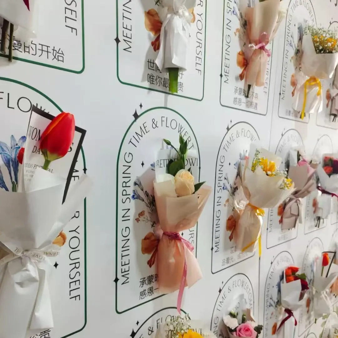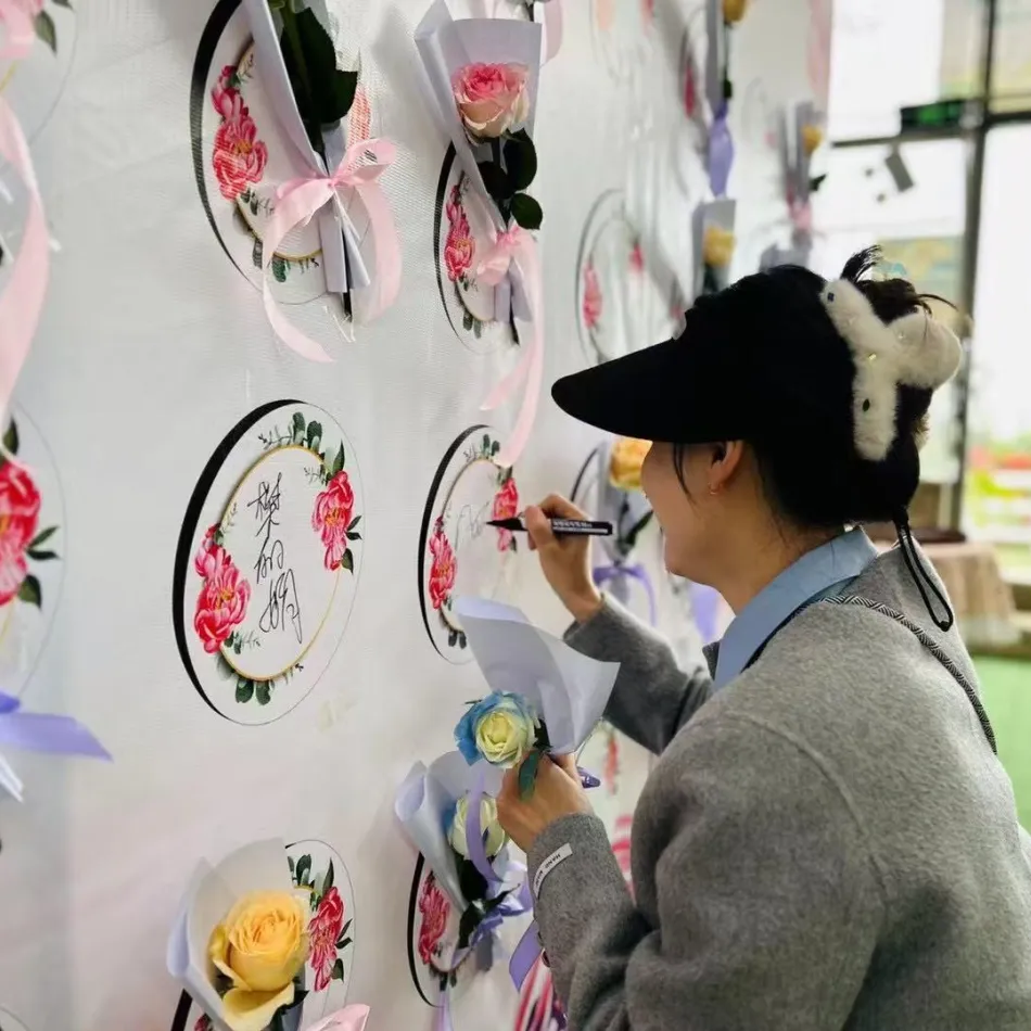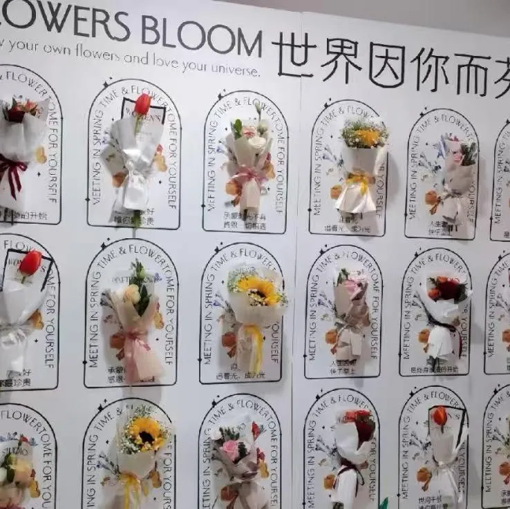 一个创意有爱的签到墙一定离不开鲜花的点缀,我们准备了不同的花供女神们自由挑选,每一个浪漫花束旁,我们都写上了对来宾美好祝福。自带香味的花束,上面生长着浪漫,传递着幸福。