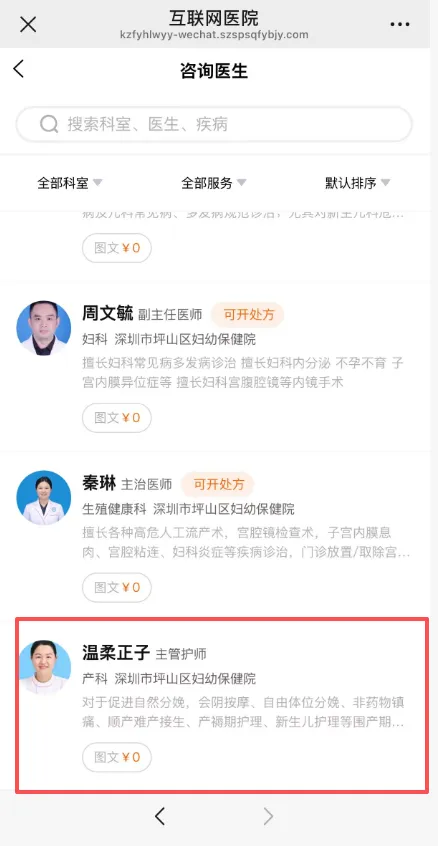 想要线上咨询孕早期知识,可在“深圳市坪山区妇幼保健院”公众号菜单栏点击【就诊服务】→【互联网医院】 →【在线咨询】→ 选择专业医师