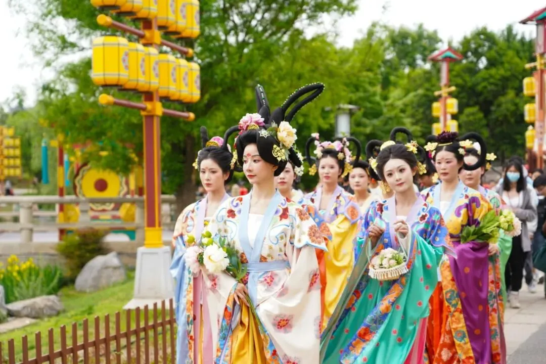 👉 3月7日、8日,应天门、明堂天堂与九洲池联动呈现“唐宫献花礼”,唐装宫女为女性游客亲手簪花,在花影霓裳中一秒入唐。