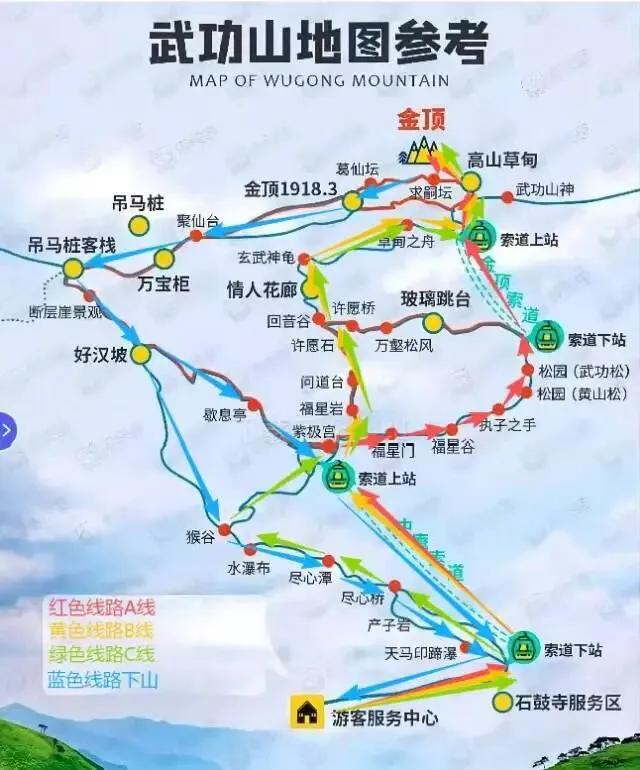 答:A线:上山中庵索道+金顶索道+徒步1公里台阶累计爬升350米,预计耗时2小时;B线:上山中庵索道+徒步2.5公里累计爬升600米,预计耗时3小时;C线:上山全程台阶游道5.5公里累计爬升1300米,预计耗时4.5小时;下山走吊马庄游道台阶6.5公里预计耗时3小时(可自行决定是否坐缆车下山,11月~次年3月缆车运行时间到16:30;4月~10月缆车运行时间到17:20)