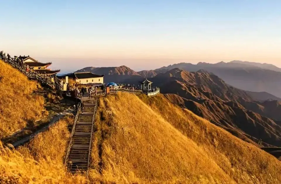 到金顶打卡后沿山脊走吊马庄下山,欣赏南方最美高山草甸。再沿游道下到中庵索道,可以选择自费坐索道下山(11月~次年3月缆车运行时间到16:30;4月~10月缆车运行时间到17:20),体能好的同学可以沿游道下山出到正山门。