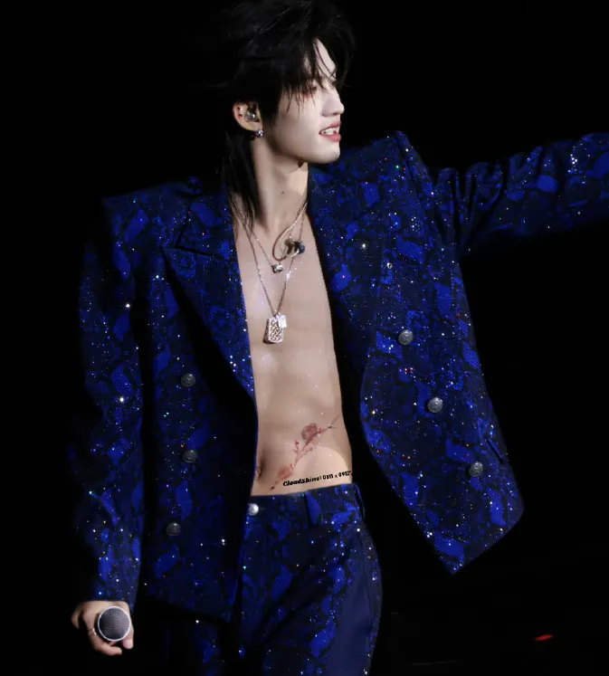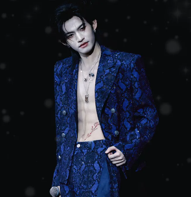 只见舞台上的云旗,一身宝蓝色西装本就亮眼,没想到还有真空设计,使其若隐若现的人腹肌更具吸引力和张力。