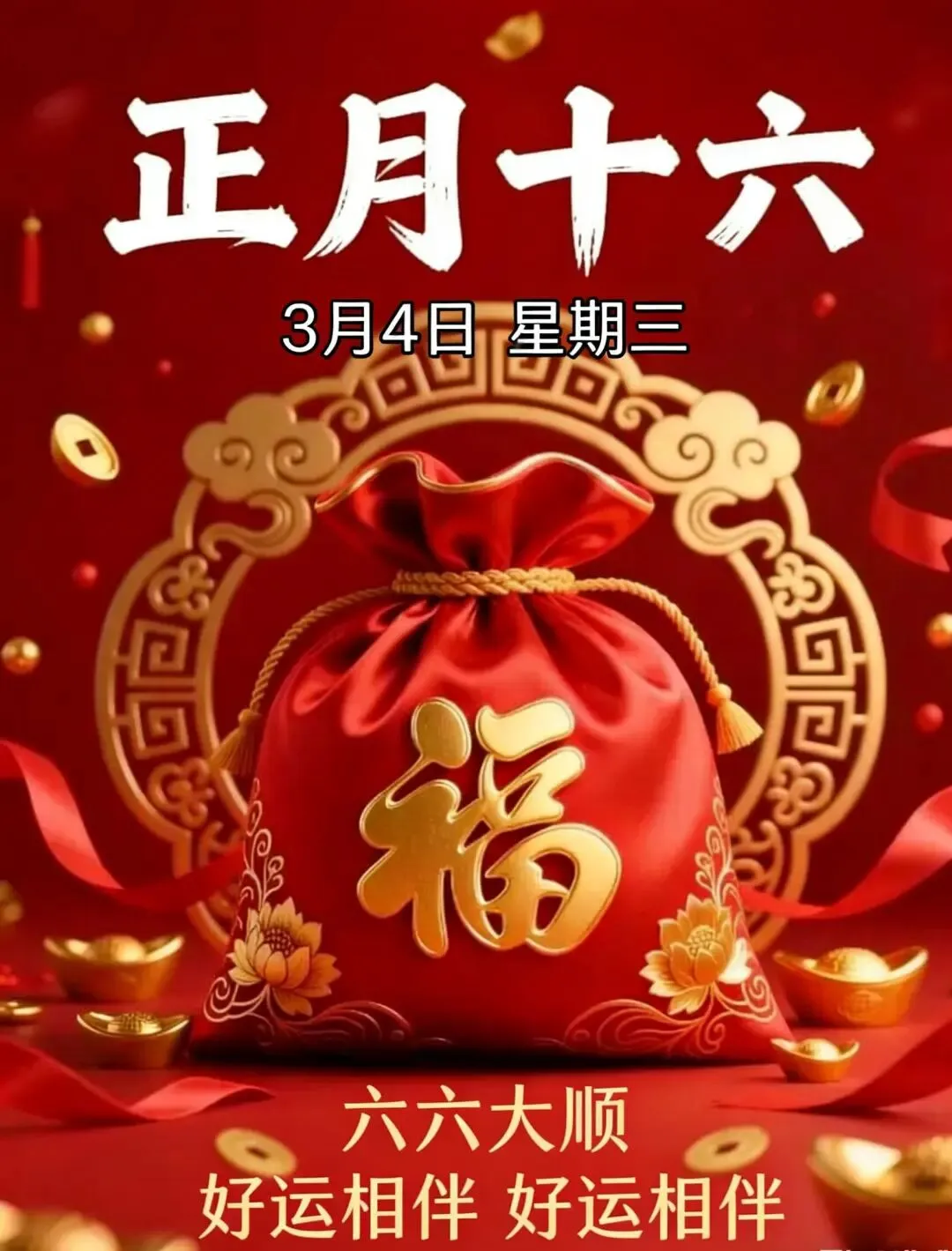 农历正月十六,打开吉祥好彩头,送出吉祥好势头,666666,顺!顺!顺!是一个送祝福的好日子,我要让你走最顺的路,说最顺的话,做最顺的事,朋友愿你事事一帆风顺,处处顺风顺水,时时顺顺利利。🌹❤️🙏☀️☕️