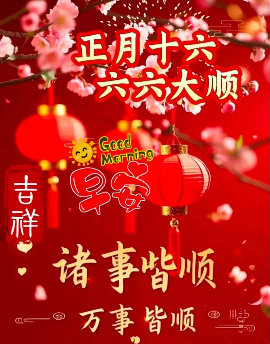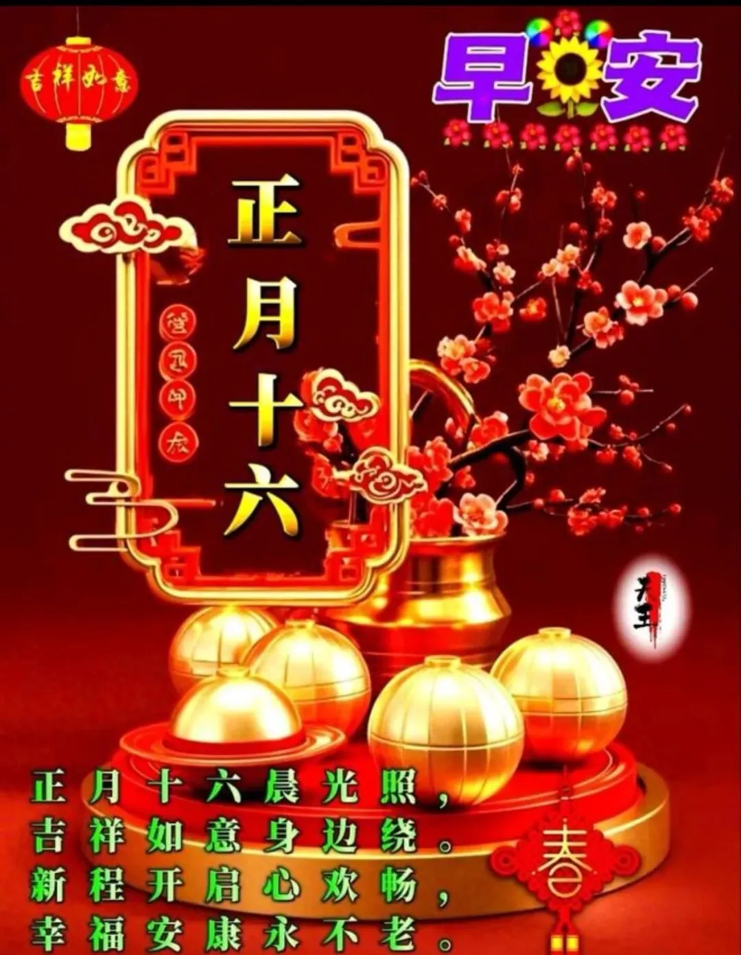 3. 早上好☀️!正月十六,是春节庆典的压轴,也是奋斗序章的开幕。闲情寄予春风里🍃,快马加鞭正当时🐎。愿你在这个辞旧迎新的节点,把过往的遗憾留在昨夜,把未来的期许握在手中。祝你今日好运久久,快乐久久,万事胜意无烦忧🧧。