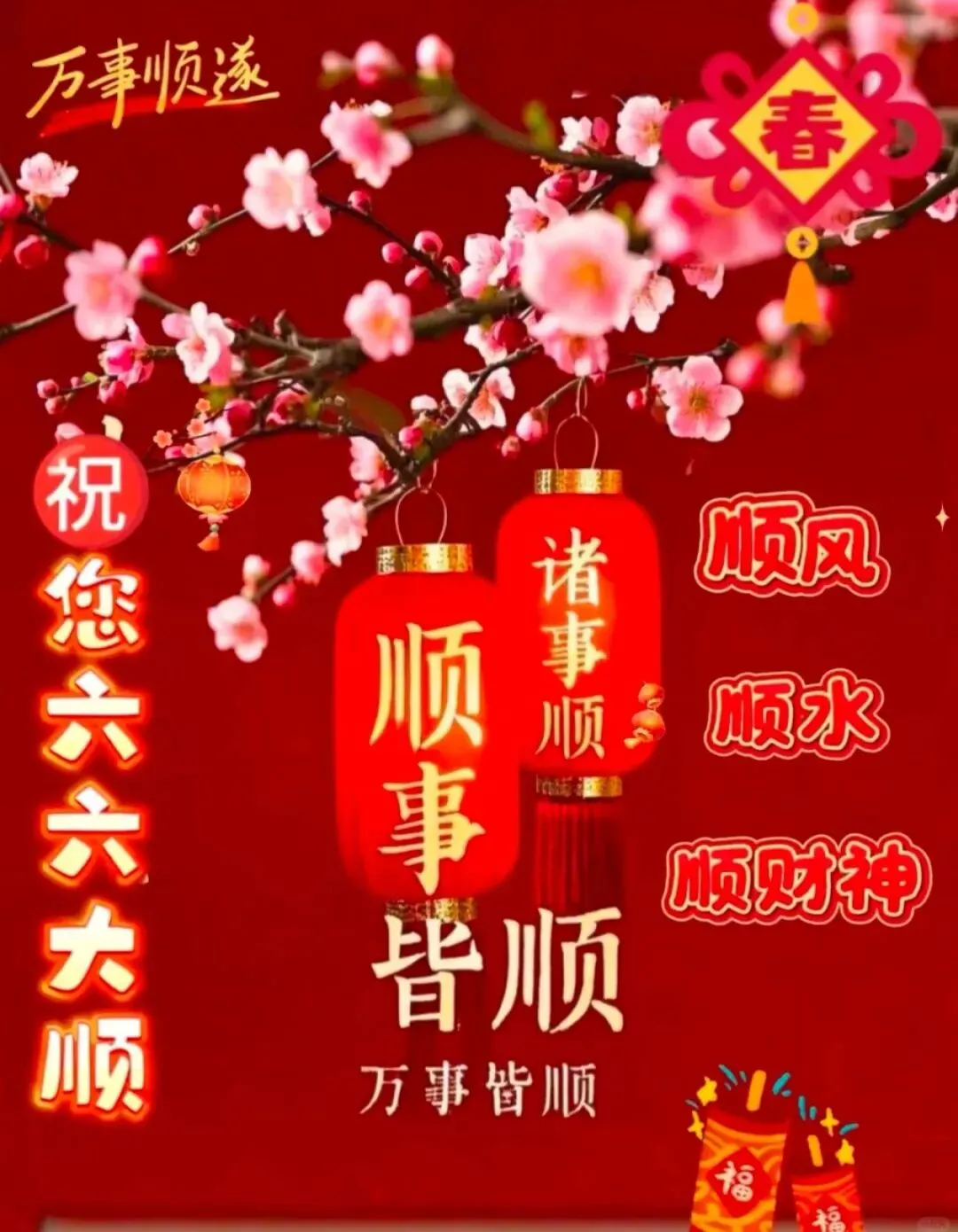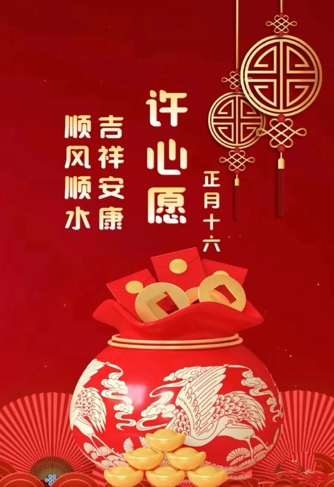 2. 正月十六,六六大顺。一顺春回大地万物苏🌱,二顺福星高照家安乐🏮,三顺良朋挚友常相伴,四顺前程似锦路宽广🌈,五顺财源广进达三江💰,六顺身心两健永安康💪。愿你今日顺,明日顺,事事顺心。十六顺,年年顺,长顺长安。