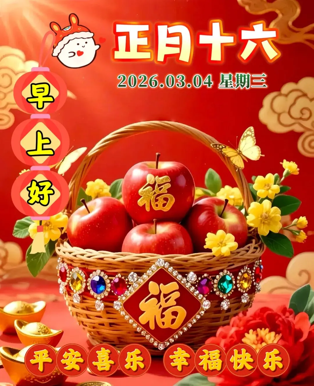 正月十六,周三早安!🌞送走热闹🎉,迎来安稳🌿,愿你在这初春时节🌱,保重身体💪,守住健康🍎,心有阳光☀️,一路芬芳🌸。愿日子清净无忧,万事皆顺✨,平安喜乐😊,幸福绵长🏮。
