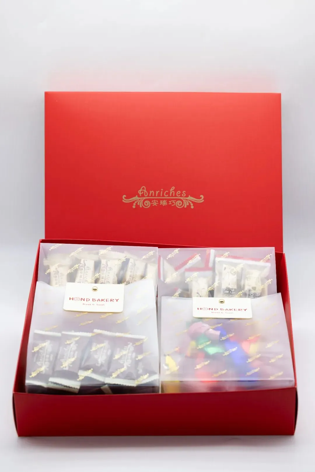 甜蜜礼盒由山核桃太妃糖、牛轧糖、巧克力饼干和黄油曲奇饼干组成。