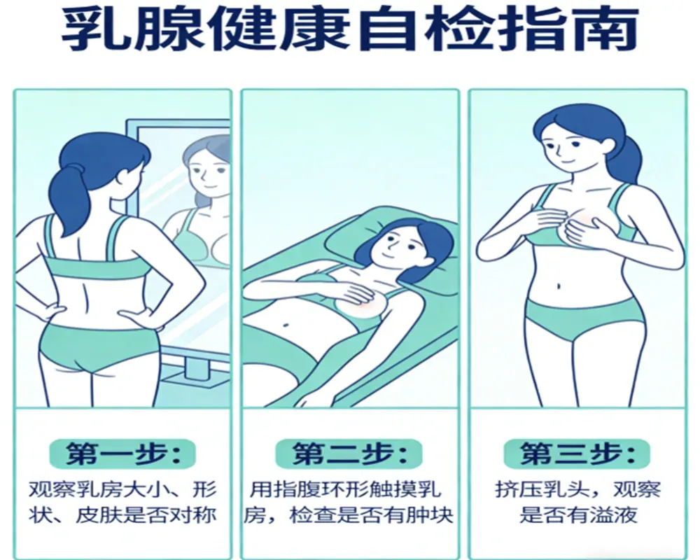 ✅ 自我检查:每月1次即可,月经结束后7-10天做最好(绝经女性固定每月某一天)。记住“看、触、挤”三步:先看乳房是否对称、皮肤有无异常、乳头有无内陷或流水;再用食指、中指、无名指的指腹,从乳房外围往乳头方向轻轻按压,力度由轻到重,排查有无肿块、压痛;最后轻轻挤压乳头,若有血性或脓性液体流出,一定要马上就医。