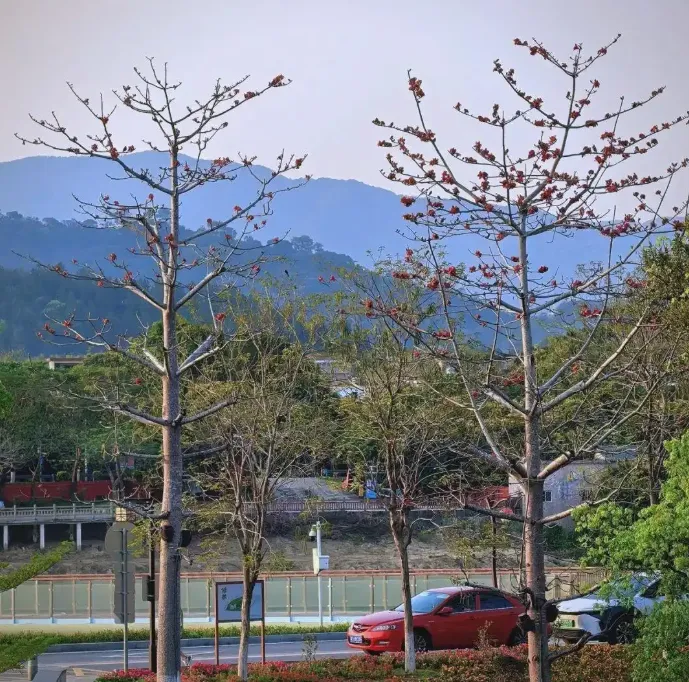 凤凰木和大叶紫薇错落有致 。