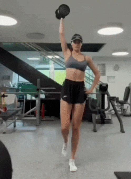 动作四:单腿支撑哑铃推举主要训练:三角肌前中束、肱三头肌、股四头肌