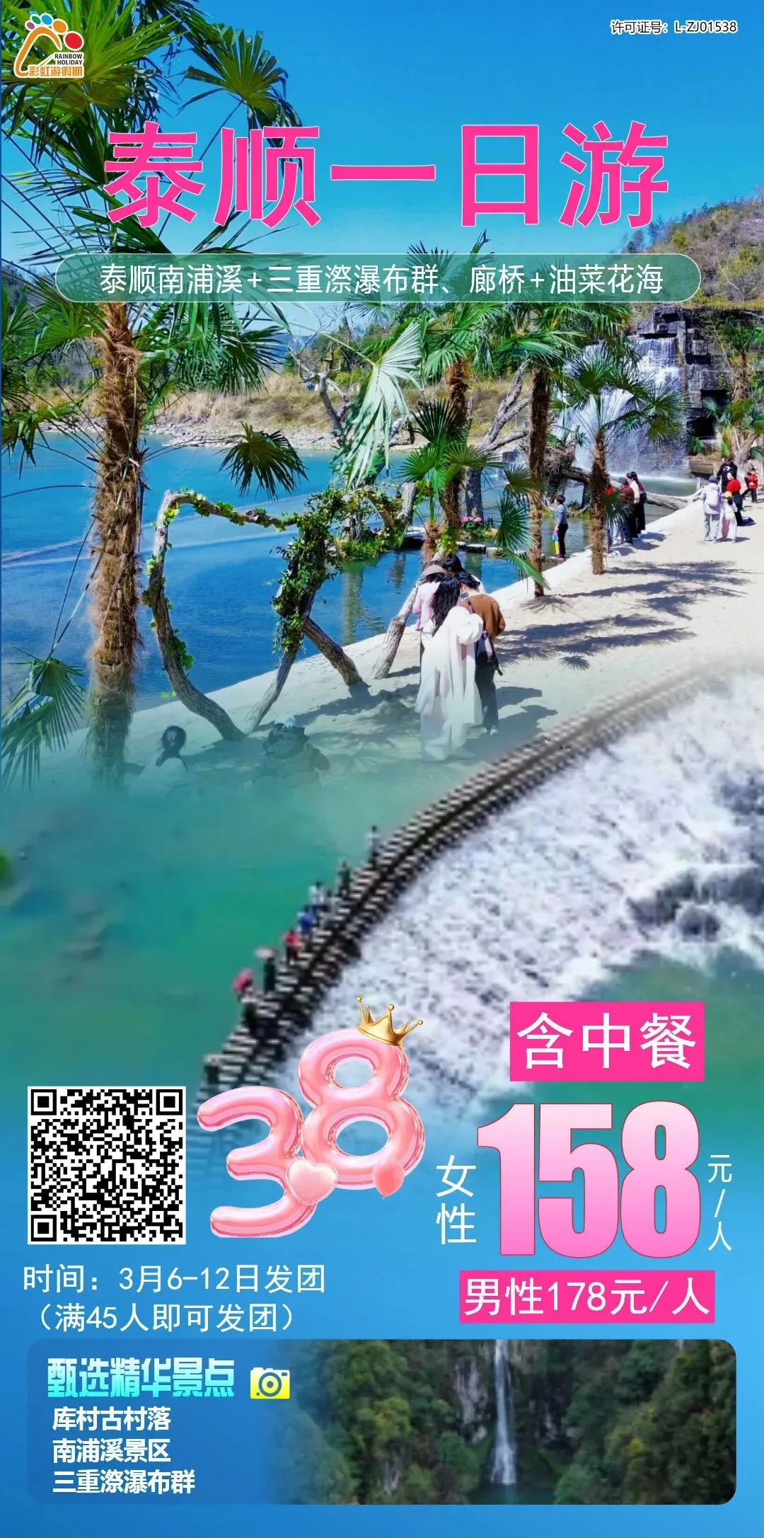 1、【三八节活动】—— 打卡泰顺网红南浦溪+三重漈瀑布群+廊桥+油菜花海纯玩1日游(含中餐)
