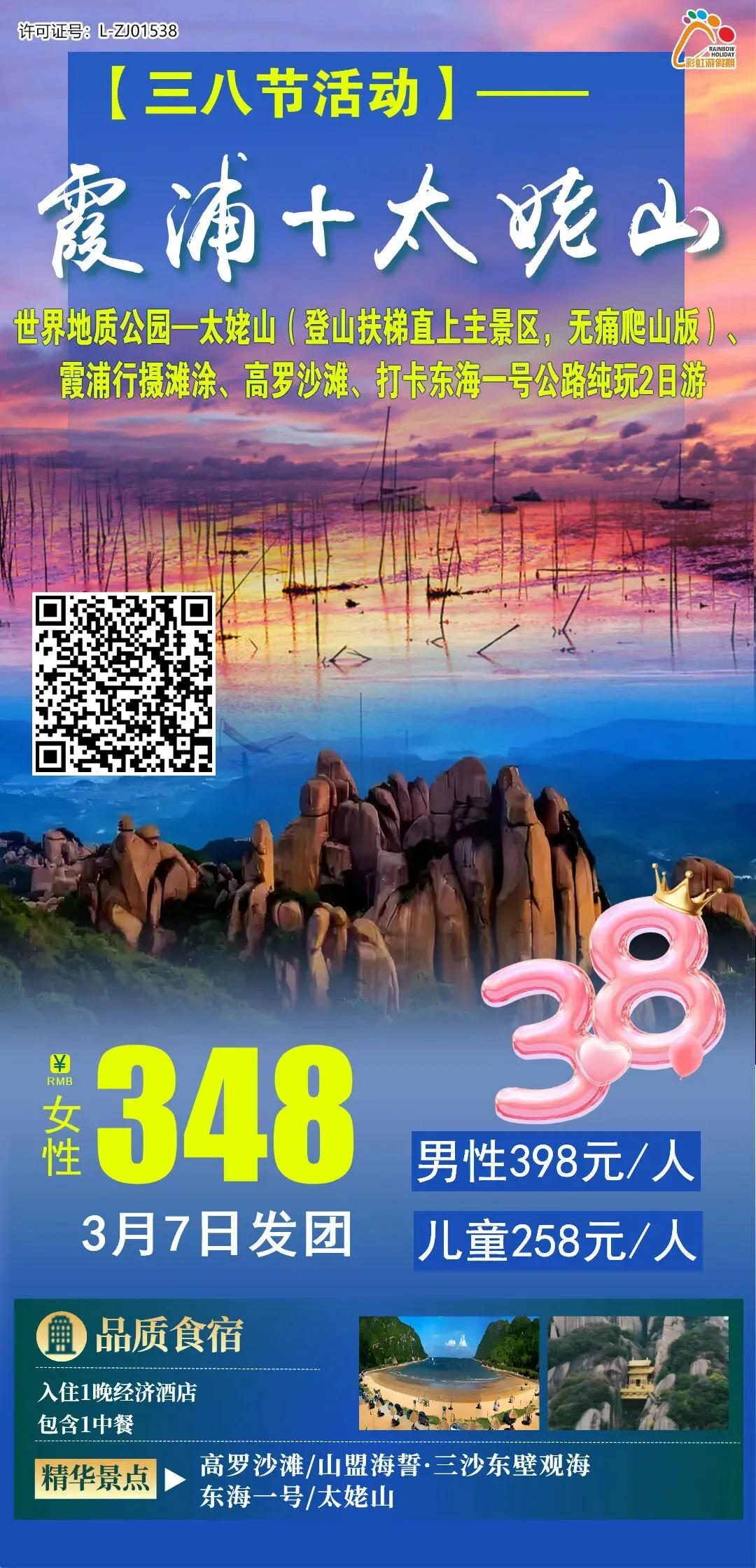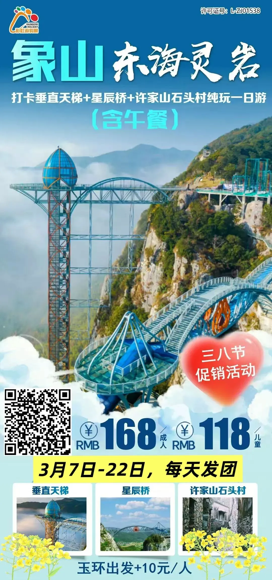 7、三八节促销活动-象山东海灵岩打卡垂直天梯+星辰桥+许家山石头村+赏油菜花纯玩一日游(赠送午餐)