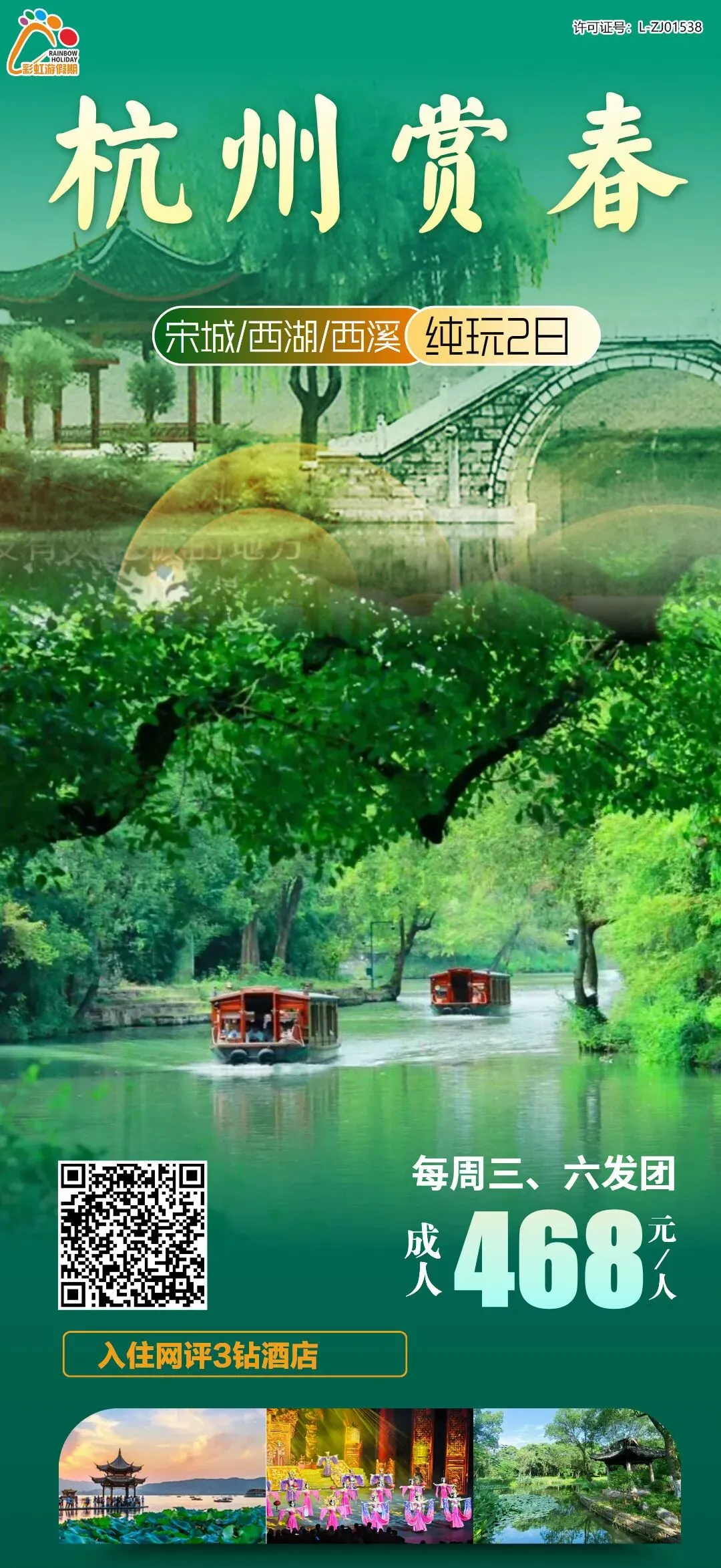 2、【杭州赏春】——杭州宋城观千古情演出、西溪湿地、西湖春色深度纯玩2日游(入住网评3钻酒店)