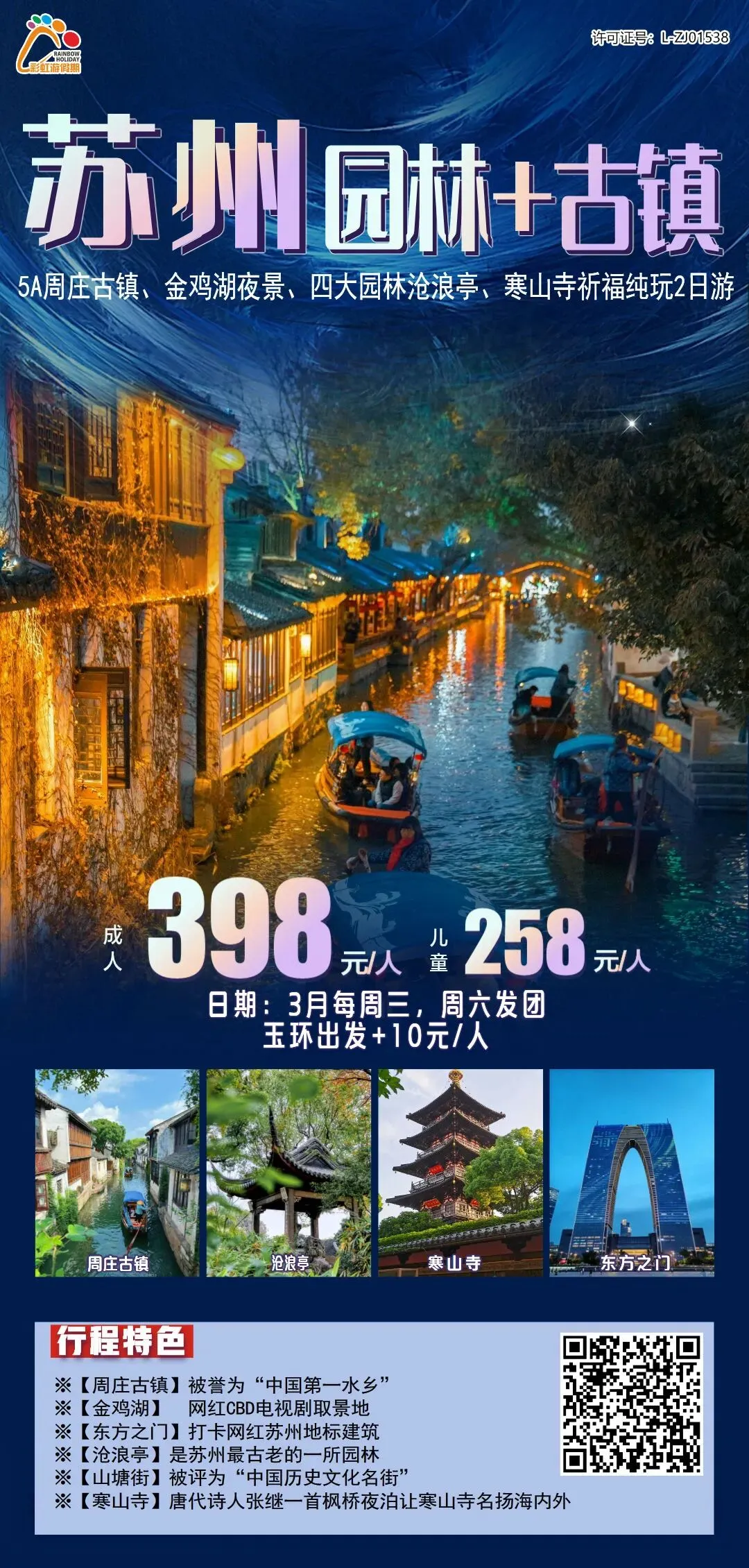 6、【苏州园林+古镇】——5A周庄古镇浪漫夜景、金鸡湖、四大园林沧浪亭、寒山寺祈福纯玩二日游(含1早1正餐)