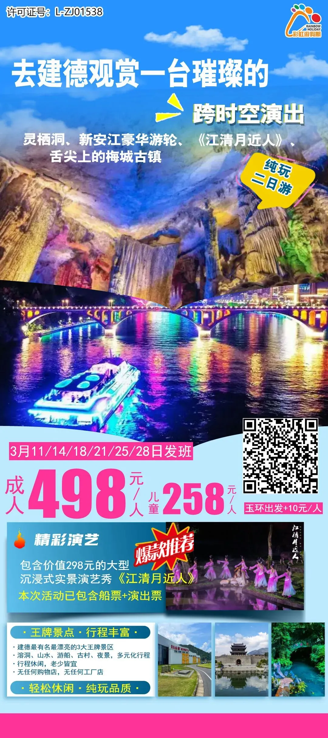 9、【江清演艺秀春季特惠】去建德观赏一台璀璨的跨时空演出! 建德灵栖洞、梦幻新安江游轮、《江清月近人》大型实景演艺秀、舌尖上的梅城古镇纯玩二日游