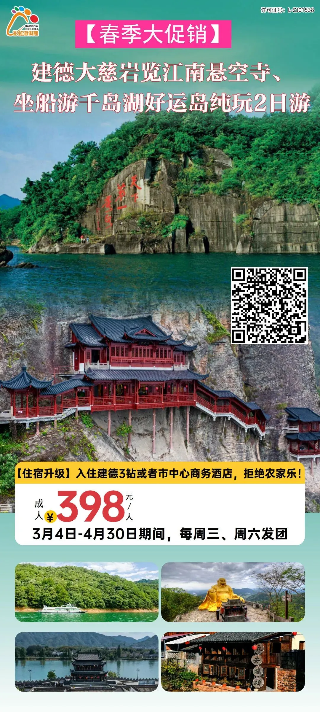 10、【春季大促销】去建德大慈岩览江南悬空寺、坐船游千岛湖好运岛、游埠古镇+严州古城“双网红”·美食之旅纯玩2日游